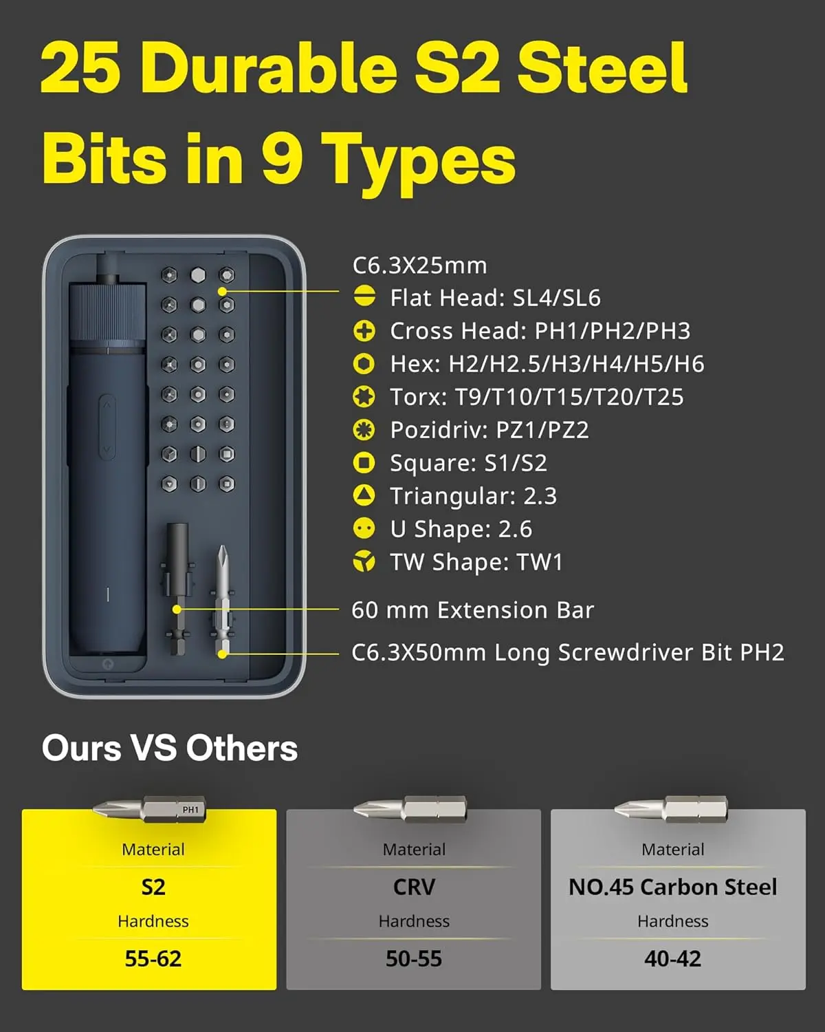·ULTRA-CONVENIENT - 25 solid S2 steel drill bits with 60HRC strength for long-lasting durability (1x Magnetic Long Bit | 24x Regular Bits). Swap bits in a blink with the magnetic tip and tackle tight spots with the extension rod. And the auto-on, no-shadow circular LED. It's a mini light show in your palm, turning you into a maestro even in the dark. Whether you're assembling furniture, diving into DIY adventures, or tackling electrical repairs, this electric screwdriver set's got your back