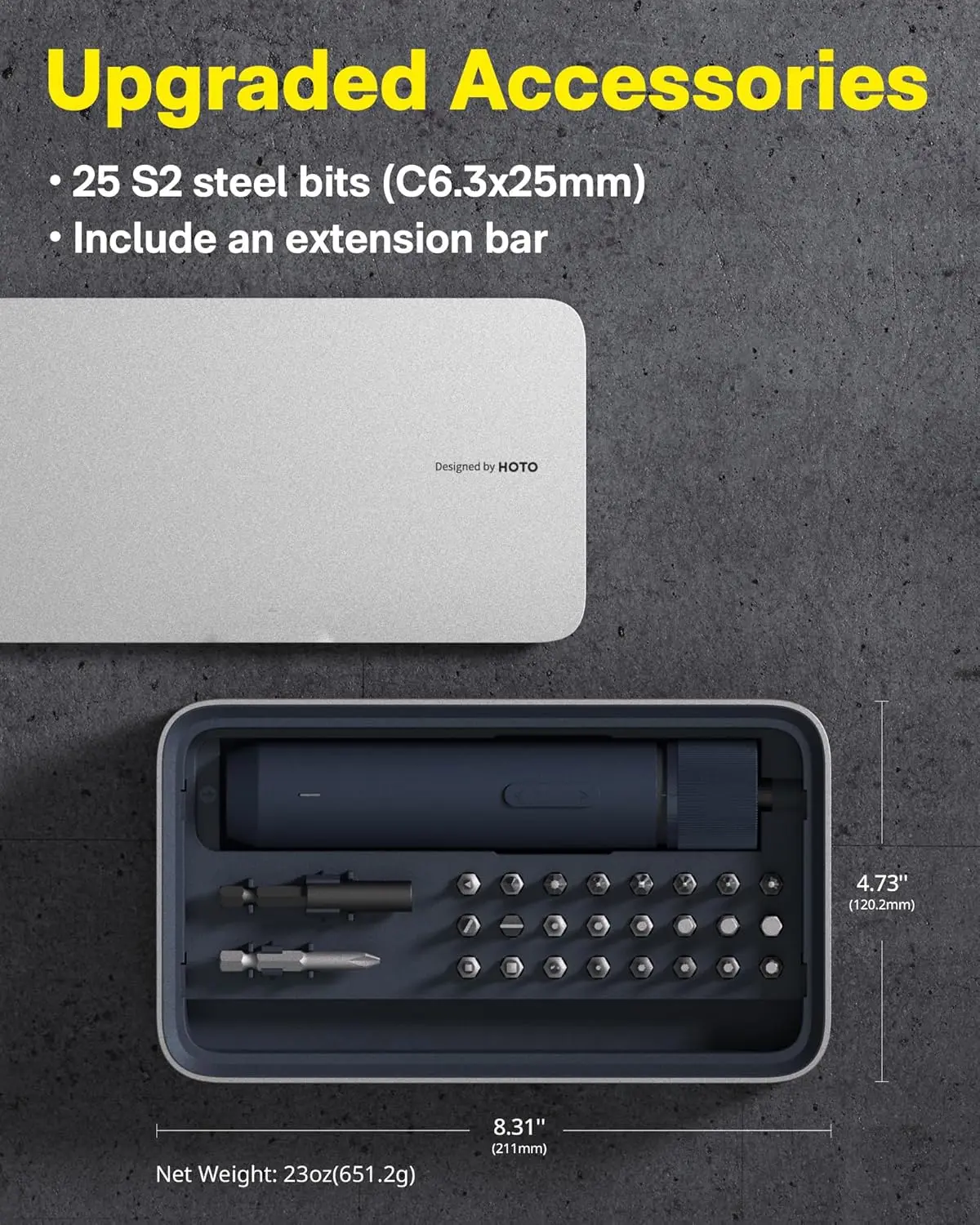 ·DIY DREAM KIT IN A BOX! - Unlock your DIY potential with this all-inclusive kit: 1 x Cordless Screwdriver, 1 X Extended Bar (60mm), 1 x 24-piece Bit Set (C6.3x25mm), 1 X Long PH2 Bit (C.6.3x50mm), 1 x Magnetic Storage Box with Snap-on Lid, 1 x User Manual;DESCRIPTION OF THE CHARGING MODULE! - It has a charging port but does not include a charging cable.Please note.