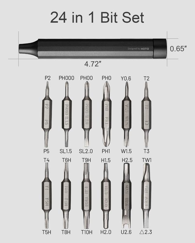 The 24 types of bits are suitable professional magnetic mini repair tool kit for phone, computer, watch, laptop, macbook, game console, eyeglass, electronic for 10 major kinds.