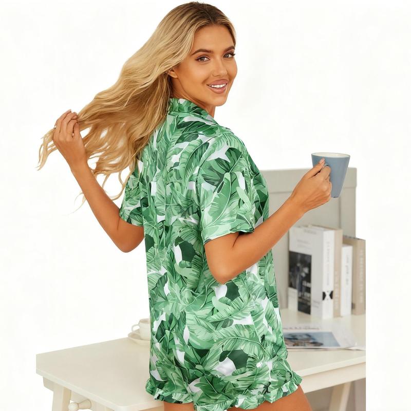 This set includes a button-down top and shorts, perfect for cozy evenings. The satin material offers a luxurious feel, while the notch collar adds a touch of sophistication. Ideal for sleepwear or homewear, this set is a blend of comfort and style. The ruffle lingerie detail enhances its appeal, making it a standout piece.