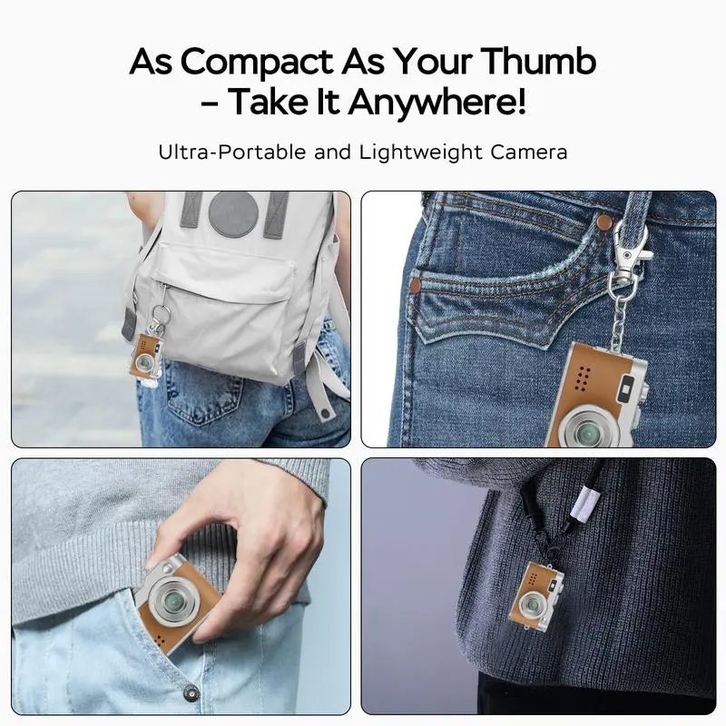 The HOTU Mini Leather Keychain Digital Camera delivers 1080P HD video. The 1MP SP1405 lens captures sharp, vibrant images. Ideal for travel, parties, and pets, this retro camera is perfect for spontaneous moments. The 0.96-inch screen provides quick viewing. Simple three-button controls—shutter, mode/power, up/down—facilitate plug-and-play operation for all ages.