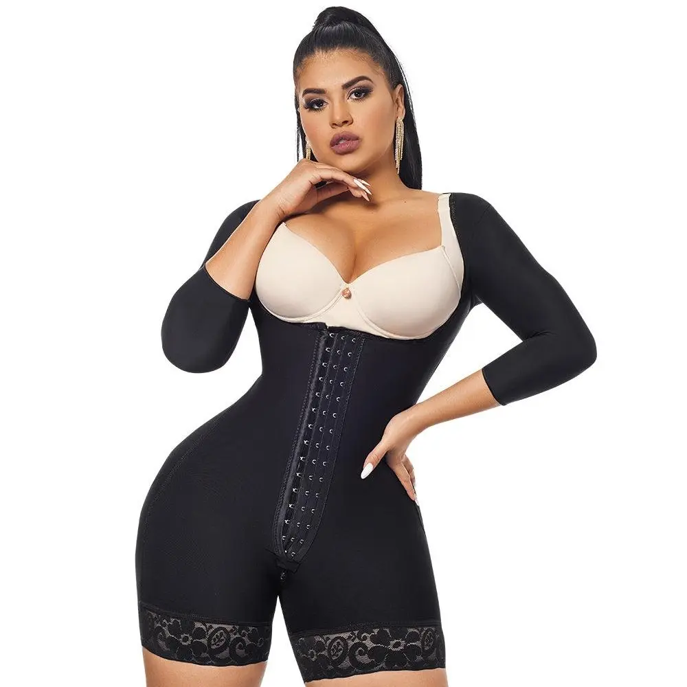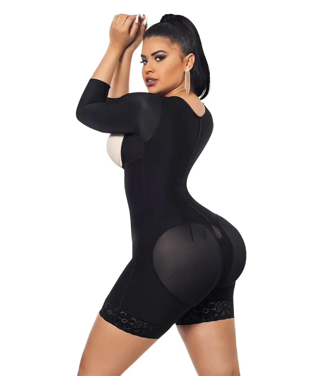 Achieve even more impressive definition of your curves with this hourglass shapewear. It's the perfect choice for women with a small waist and large glutes, allowing them to feel sophisticated and elegant every day. Its exclusive design features long sleeves and central abdominal hooks, naturally accentuating your curves. It can help reduce your waist by up to 2 sizes, providing uniform compression in the lower, middle, and upper abdomen. When wearing this garment, your arms will be covered, reducing sagging and giving them a more defined and beautiful appearance, just like your glutes, which will receive natural enhancement. The silicone lace ensures that it won't show or roll up under your daily clothes. Designed to fit any occasion, it includes a convenient and easy-to-use perineal zipper, allowing you to use the bathroom quickly and securely without needing to remove it completely. Choose elegance with this garment that fits your lifestyle! Exclusive long sleeve design 3-position hooks – hourglass effect Perineal zipper Ultra glute enhancement Silicone lace prevents marking on clothing Triple abdominal reinforcement Special packaging for ice therapy Fully lined with extremely soft fabric for your skin