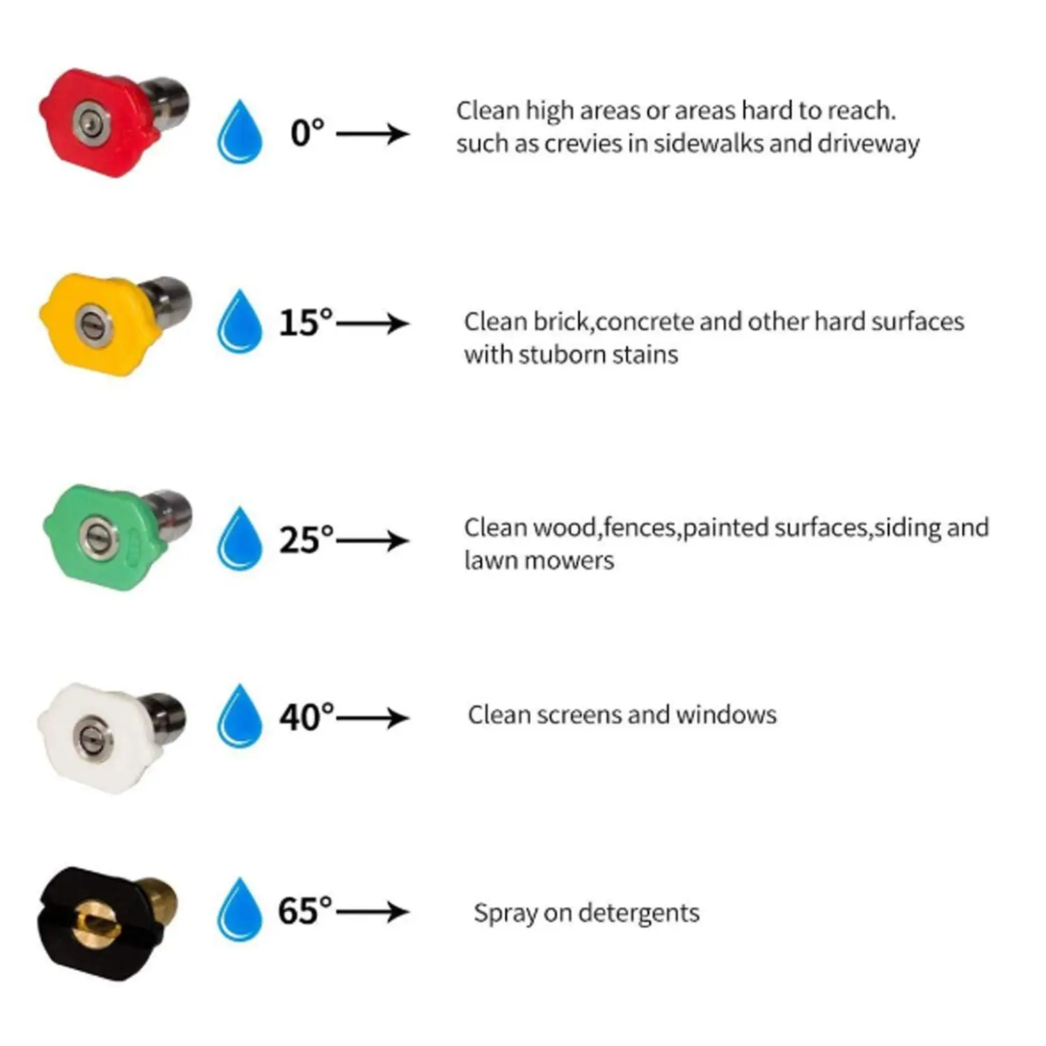 ·NOT for water hose or garden hose. This product contains 5 nozzles, the nozzles have different angles (0, 15, 25, 40, 65), allowing you to choose nozzles with different angles according to your needs