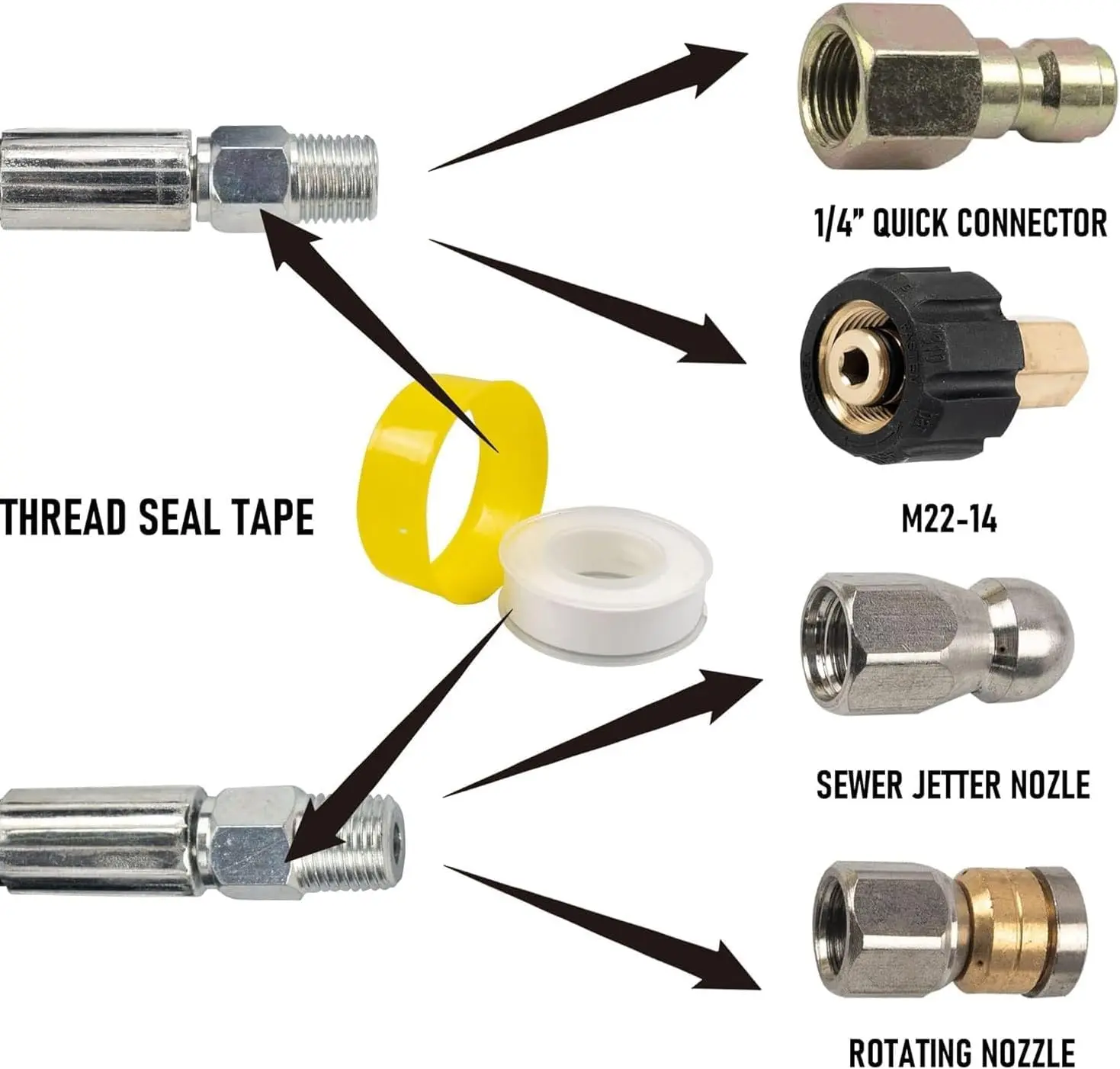 ·Fully Equipped: The package comes with a power washer hose and 5 adapters to handle a wide range of applications. Included are 2 x M22-14mm female to 3/8" plug, 2 x M22-14mm male to 3/8" quick connector, and 1 x M22-14mm male to M22-14mm male