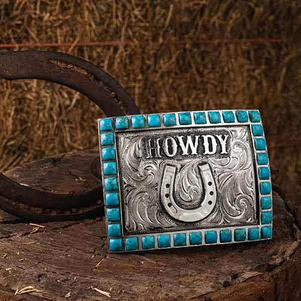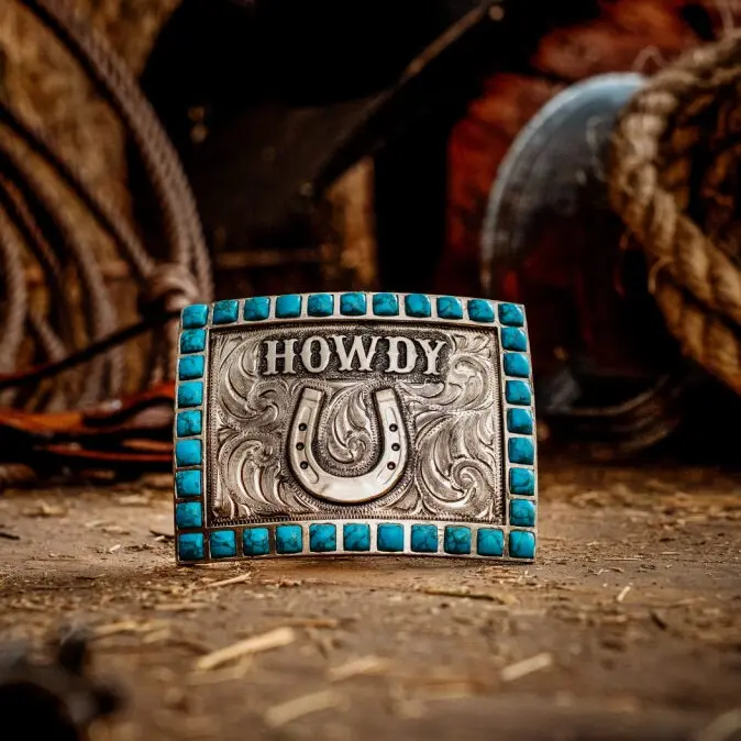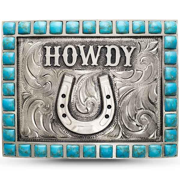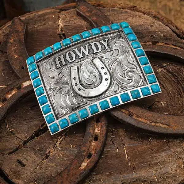 Howdy Belt Buckle – German Silver | Hand Engraved | Turquoise Stones| Horseshoe Logo