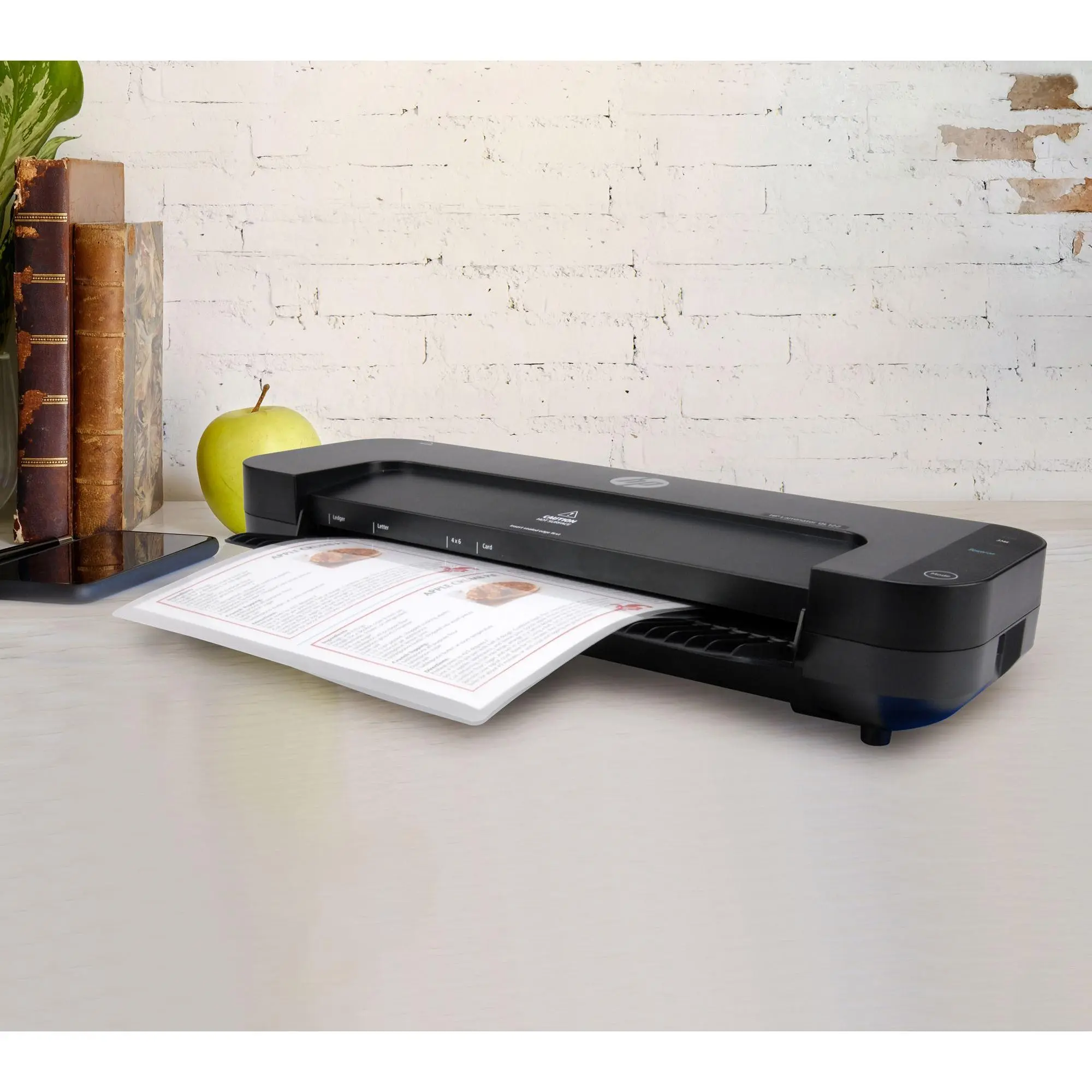 This bundle includes a paper trimmer and corner cutter that rounds corners one sheet at a time. From HP.