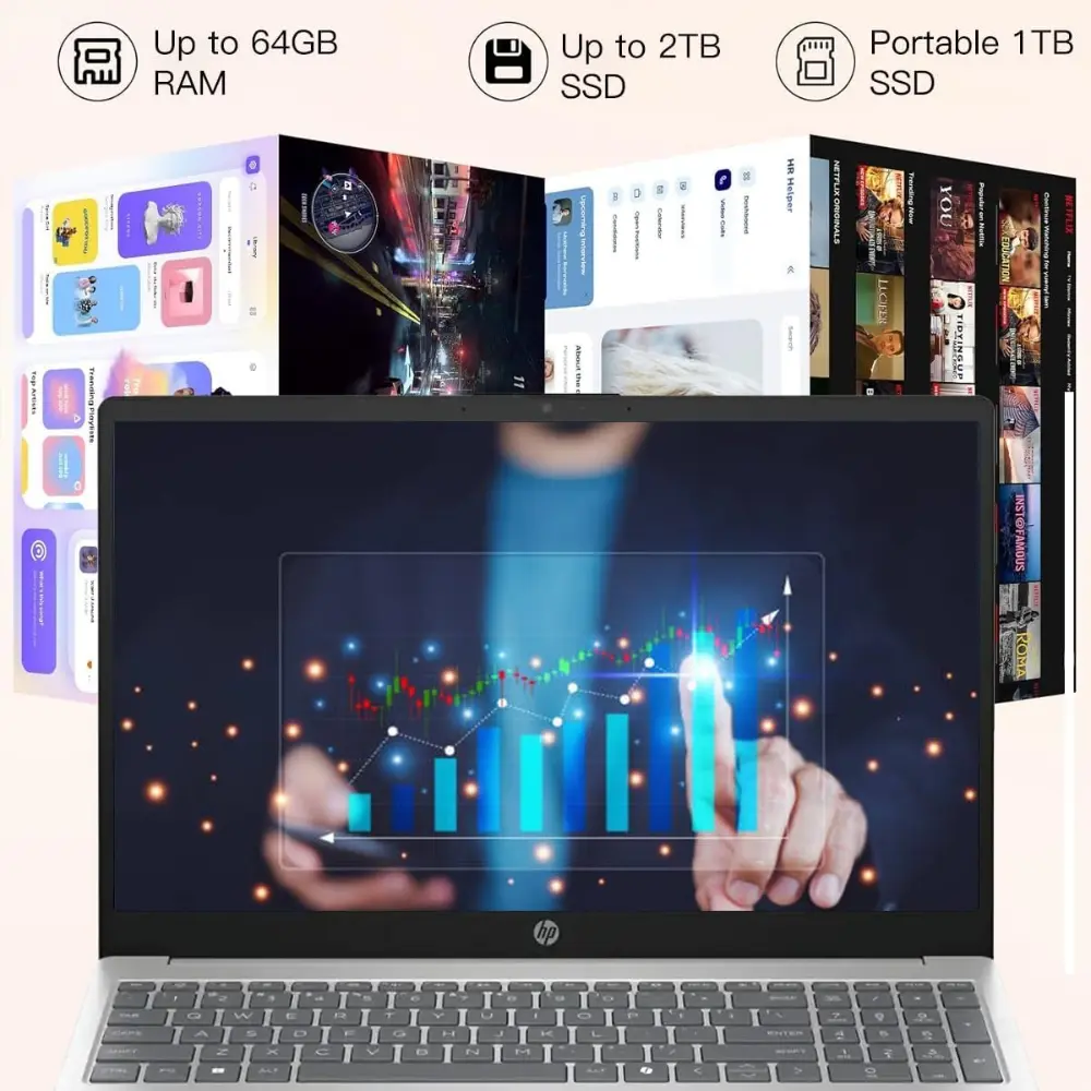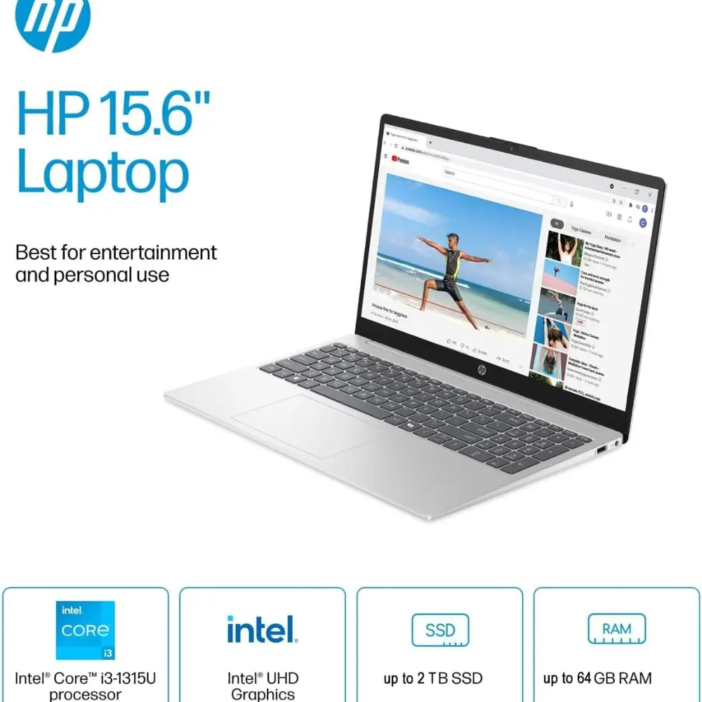·13th Generation Intel Core i3-1315U processor:Go beyond performance scores and experience what real-world productivity feels like. Level up your multitasking with speedy processing power and a smoother computing experience.Intel UHD Graphics:Smoothly stream 4K content to enhance your presentations. See the UHD difference when you play your favorite games.15.6-in HD Touch Display:Control your PC with just a touch. Pinch, zoom, tap, and swipe the 15.6-inch diagonal screen for an intuitive experience.PRODUCT INFORMATION:Brand: HPProcessor Model: Intel 13th Generation Core i3Processor: Intel 6- cores i3-1315U ProcessorType of Memory (RAM): DDR4System Memory RAM Speed: 3200 megahertzCPU Boost Clock Frequency: 4.5 gigahertzNumber of CPU Cores: 6-coreL3 Cache: 10 megabytesMemory: Up to 64GBStorage: 2TB SSDDisplay: 15.6" Touchscreen LED HD (1366 x 768)Graphics: Intel UHD GraphicsWireless Connectivity: Realtek Wi-Fi 6 and Bluetooth 5.3Operating System: Windows 11 proFront Facing Camera Video Resolution:720pBuilt-In Microphone: YesDISPLAY:Screen Size: 15.6 inchesScreen Resolution: 1366 x 768 (HD)Touch Screen: YesBrightness: 250 nitsBacklit Keyboard: NoColor: Natural SilverYear of Release: 2025Color Gamut (NTSC): 45 percentPorts & Slots:1 x USB-C 3.02 x USB-A 3.01x HDMI 1.41x Headset JackDimensions: 14.17" L x 9.29" W x 0.73" HWeight: Approximately 3.52 lbs