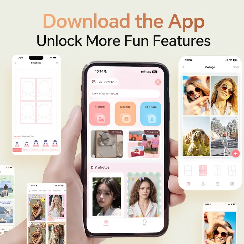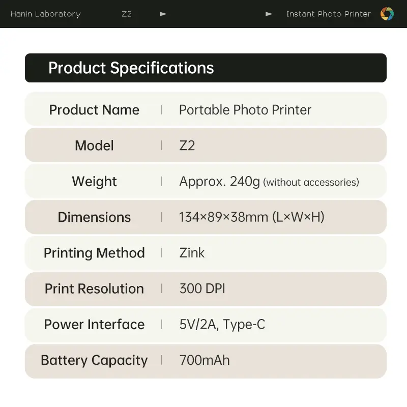 The HPRT Z2 is a compact, portable all-in-one instant camera and mini color photo printer. Perfect for phone printing, it's ideal for trips. Comes with 5 sheets. This device combines photography and printing in one sleek, easy-to-carry package. Capture moments and print them instantly.