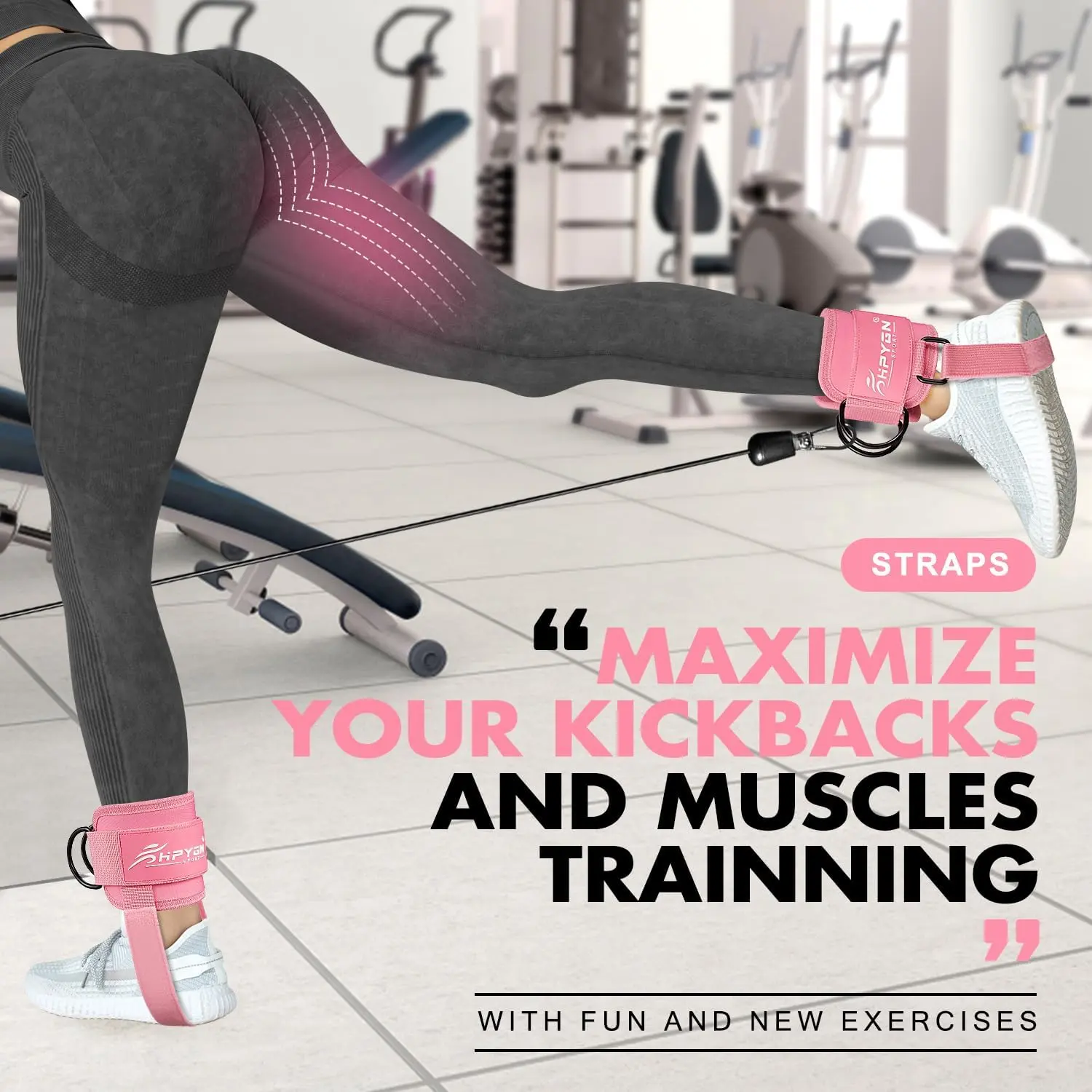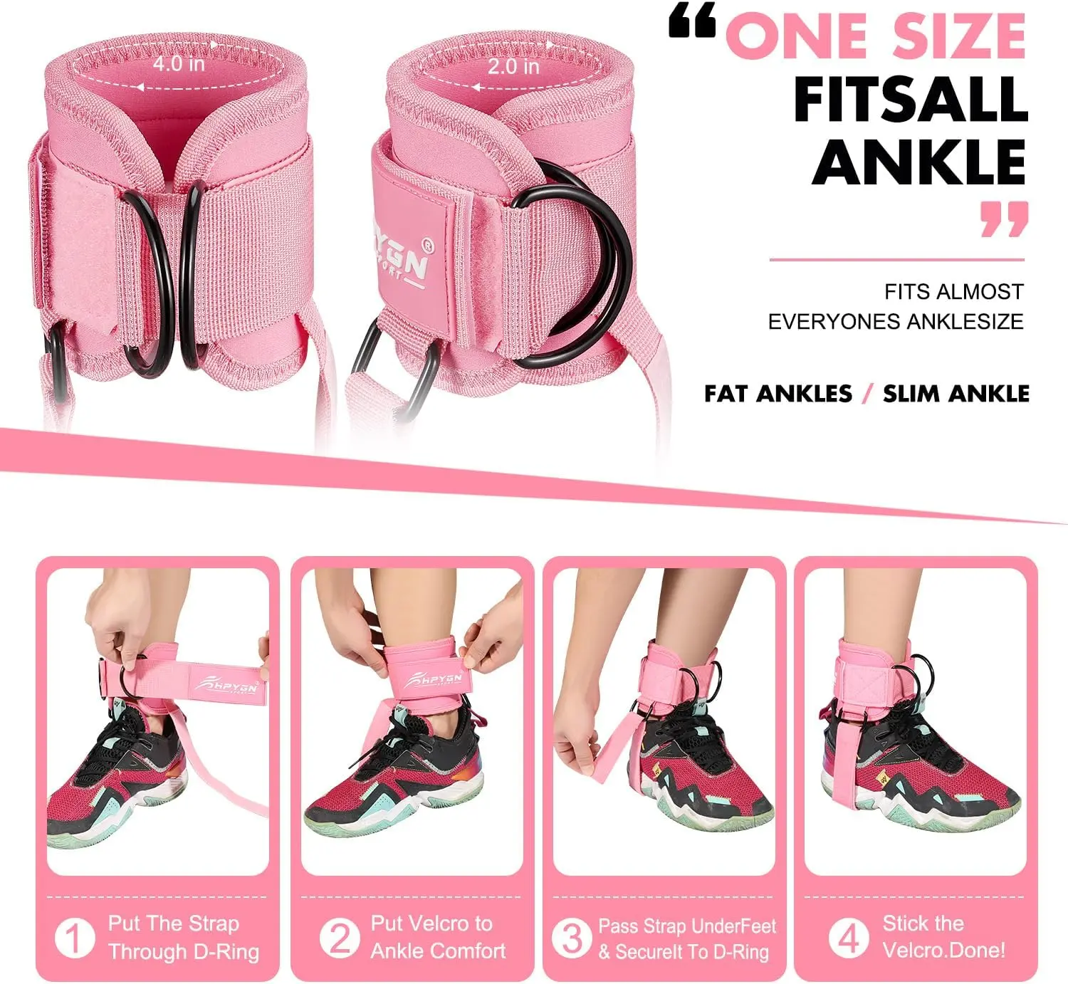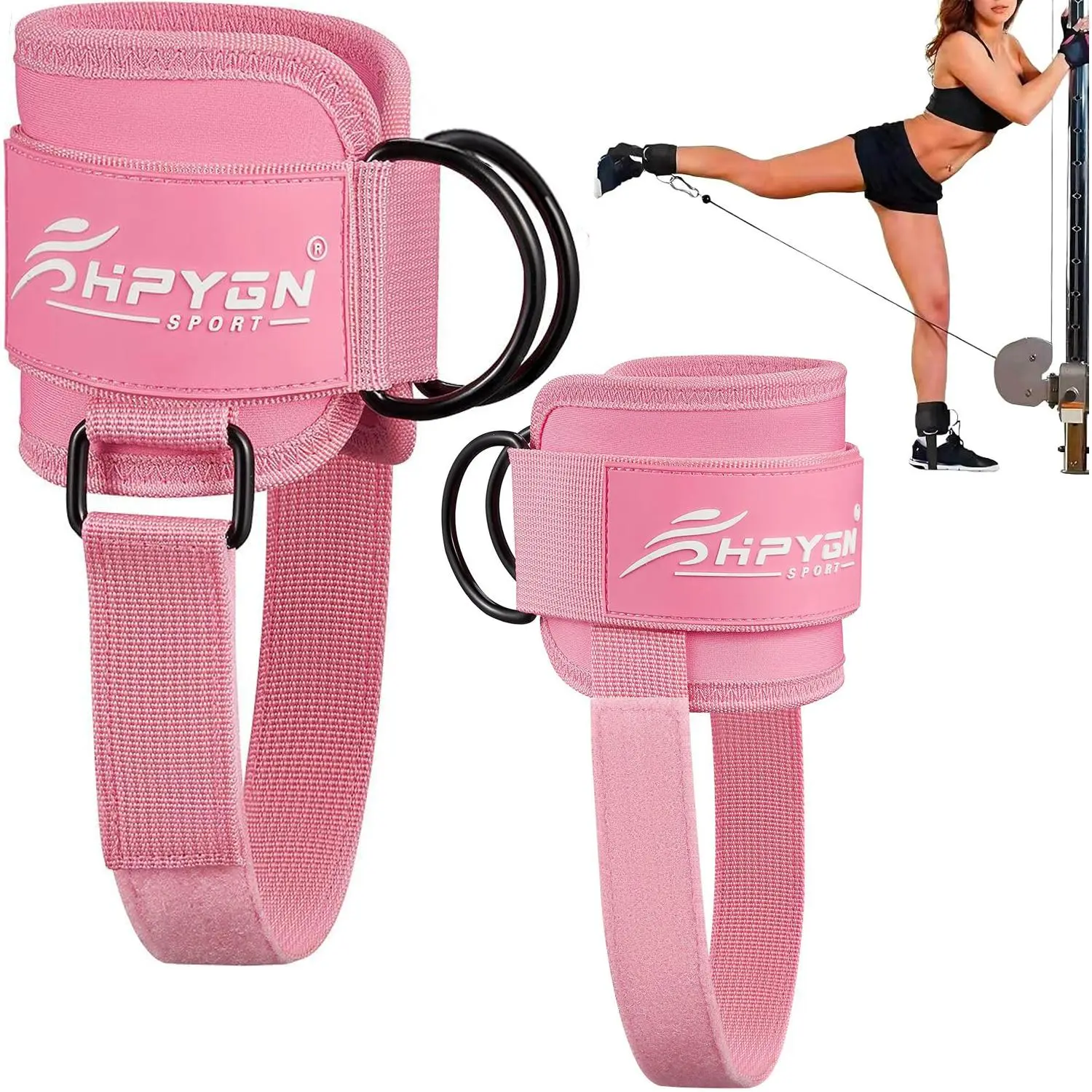 HPYGN cable leg attachments for gym are different. Our unique, cleverly designed kickback straps hold the main strap firmly in place, stopping it from sliding up your leg. That means that even if youâre pulling a heavy weight, your straps will grip onto your ankles and never let go - without shifting or chafing. No matter how hard you work out, you can be confident the cable ankle attachments for gym will hold up.
