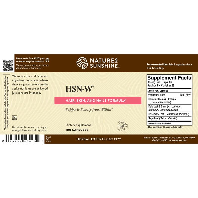 Nature’s Sunshine HSN-W, suplemento para cabello piel y uñas, fórmula herbal belleza, vitaminas naturales cabello, uñas fuertes, piel saludable, suplemento herbal natural, belleza desde adentro #NaturesSunshine #HSN  #CabelloSano #PielRadiante  #UñasFuertes
