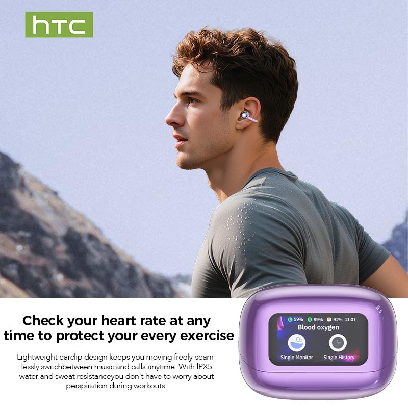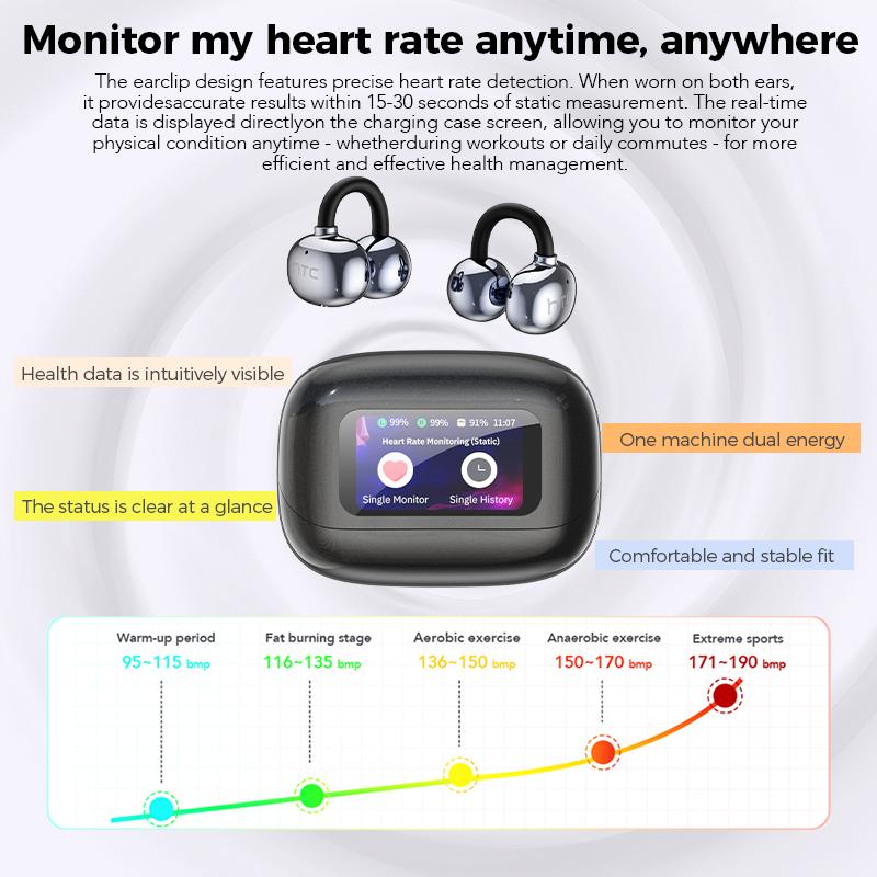 HTC NE41 Clip-On Ear Headphones ,Heart Rate Monitoring Earbuds, Blood Oxygen Monitoring Earbuds,Headphones for Music & Phone Calls, IPX5 Sport Waterproof & Sweatproof, with LCD Full Color Touch Screen, Bluetooth 6.0 Headsets, Heart Rate Health Management