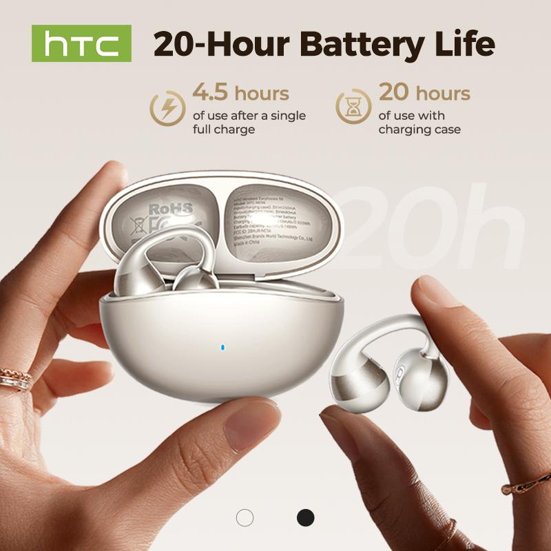 HTC NE56 OWS - New clip-on ea Cómodo de usar: Diseñados para un uso prolongado, lo que aumenta la comodidad durante su uso. Carga conveniente: Incluye un estuche de carga para cargarlos fácilmente en cualquier lugar. Comunicación mejorada: Micrófono integrado para llamadas y comunicación de voz nítidas. Conectividad perfecta: Bluetooth 6.0 para una conexión inalámbrica estable y rápida. Calidad de sonido superior: Ofrece un audio nítido y excelente para una experiencia auditiva inmersiva. Diseño resistente al agua: La clasificación de resistencia al agua IPX5 garantiza su durabilidad en diversas condiciones.