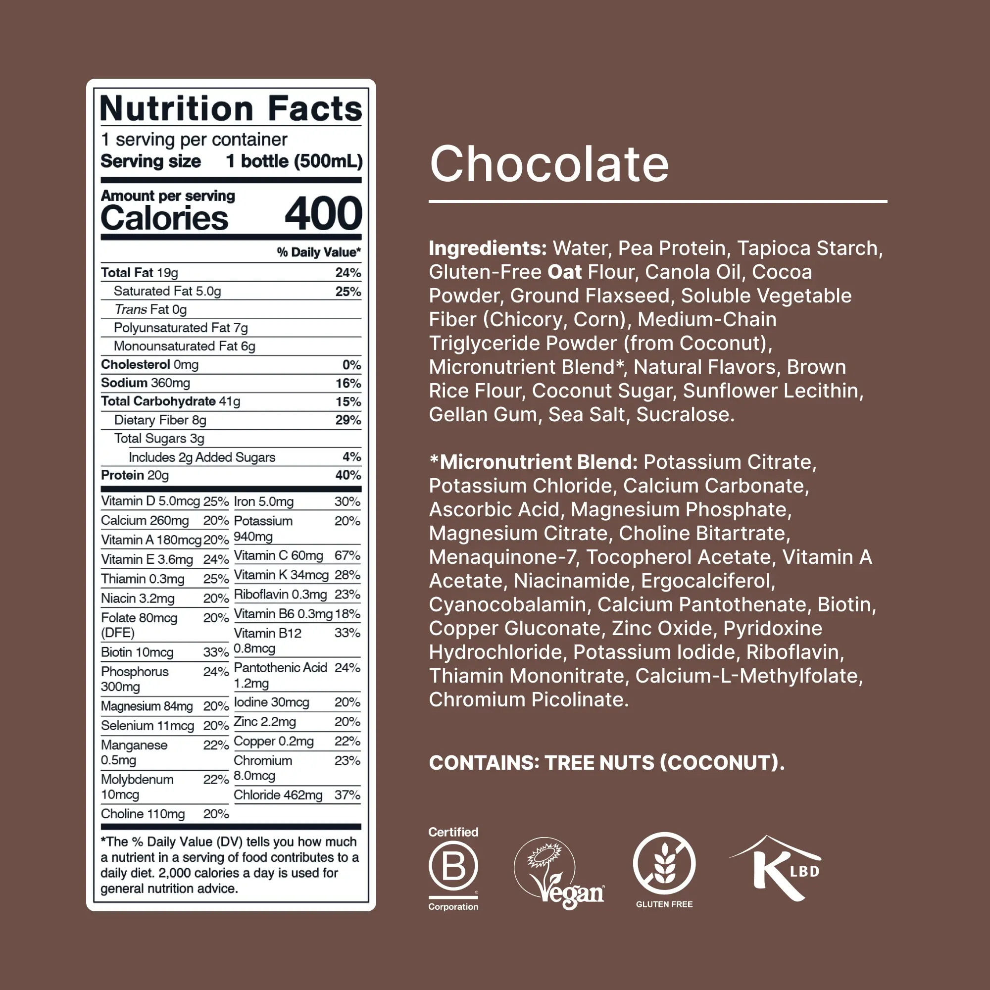 IngredientsWater,Pea Protein,Tapioca Starch,Gluten-Free Oat Flour,Canola Oil,Cocoa Powder,Ground Flaxseed,Soluble Vegetable Fiber (Chicory Root,Corn),Medium-Chain Triglyceride Powder (from Coconut),Micronutrient Blend*,Natural Flavors,Brown Rice Flour,Coconut Sugar,Sunflower Lecithin,Gellan Gum,Sea Salt,Sucralose