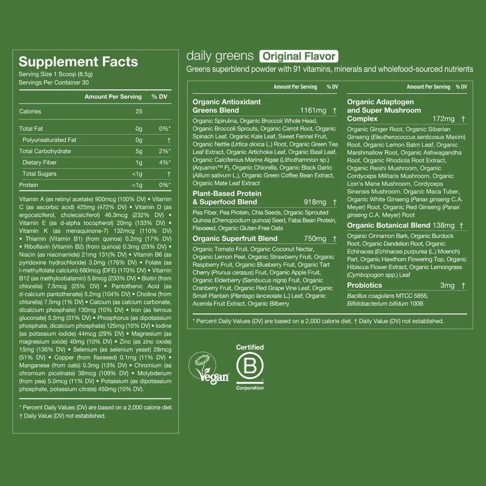 | Ingredients | Organic spirulina,organic broccoli whole head,organic broccoli sprouts,organic carrot root,organic spinach leaf,organic kale leaf,sweet fennel fruit,organic nettle (Urtica dioica L.) root,organic green tea leaf extract,organic artichoke leaf,organic basil leaf,organic calciferous marine algae (Lithothamnion sp.),Aquamin F,organic chlorella,organic black garlic (Allium sativum L.),organic green coffee bean extract,organic mate leaf extract,pea fiber,pea protein,chia seeds,organic sprouted quinoa (Chenopodium quinoa) seed,faba bean protein,flaxseed,organic gluten-free oats,organic tomato fruit,organic coconut nectar,organic lemon peel,organic strawberry fruit,organic raspberry fruit,organic blueberry fruit,organic tart cherry (Prunus cerasus) fruit,organic apple fruit,organic elderberry (Sambucus nigra) fruit,organic cranberry fruit,organic red grape vine leaf,organic small plantain (Plantago lanceolata L.) leaf,organic acerola fruit extract,organic ginger root,organic Siberian ginseng (Eleutherococcus senticosus Maxim) root,organic lemon balm leaf,organic marshmallow root,organic ashwagandha root,organic rhodiola root extract,organic reishi mushroom,organic cordyceps militaris mushroom,organic lion’s mane mushroom,cordyceps sinensis mushroom,organic maca tuber,organic white ginseng (Panax ginseng C.A. Meyer) root,organic red ginseng (Panax ginseng C.A. Meyer) root,organic cinnamon bark,organic burdock root,organic dandelion root,organic echinacea (Echinacea purpurea (L.) Moench) part,organic hawthorn flowering top,organic hibiscus flower extract,organic lemongrass (Cymbopogon spp.) leaf,Bacillus coagulans MTCC 5856,Bifidobacterium bifidum 100B,tapioca starch,natural flavors,silicon dioxide,guar gum,organic stevia leaf extract |