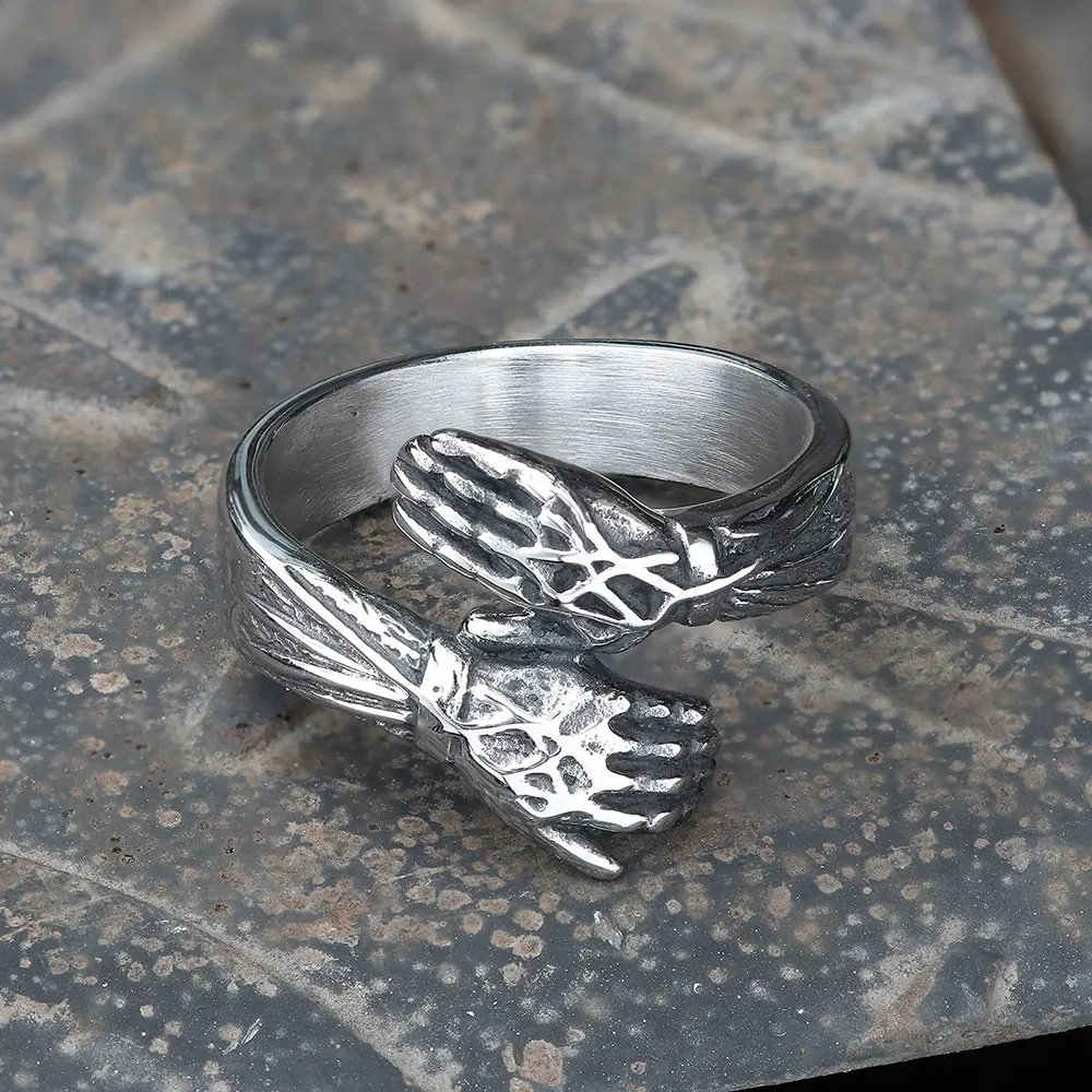 ·The ring consists of a curved flat band with tiny hands at each end, which creates a hugging effect when worn on your finger. This polished and distressed ring has a comfortable wearing experience and a super texture. Order this unique and lovely ring today!