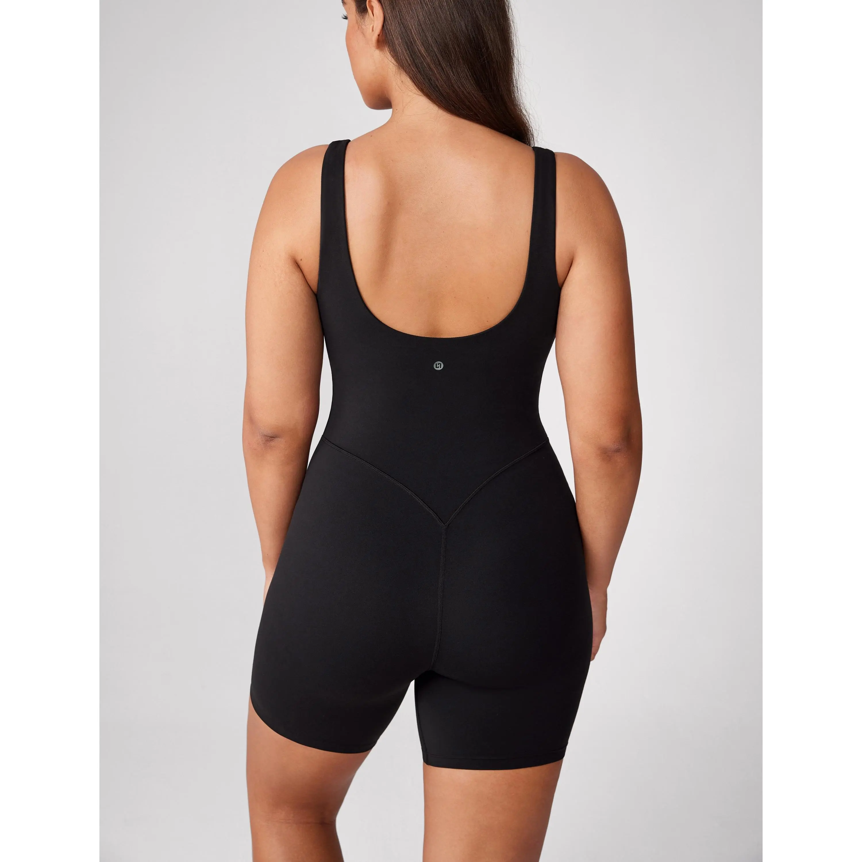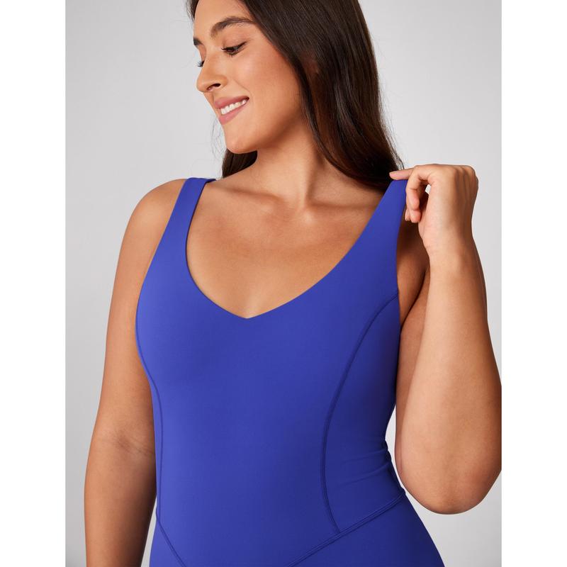 Medium-compression, buttery-soft fabric with 4-way stretch for comfort and support. Features a flattering V-neck, seamless 6" shorts, and removable pads. Stylish one-piece design—ideal for yoga, workouts, and daily wear