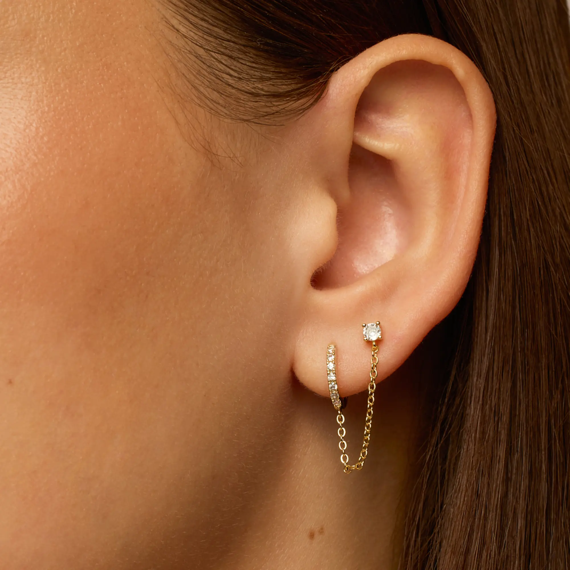 ·Chained cubic zirconia huggie x cubic zirconia stud that features a 32mm long connecting chain.
