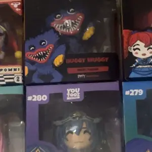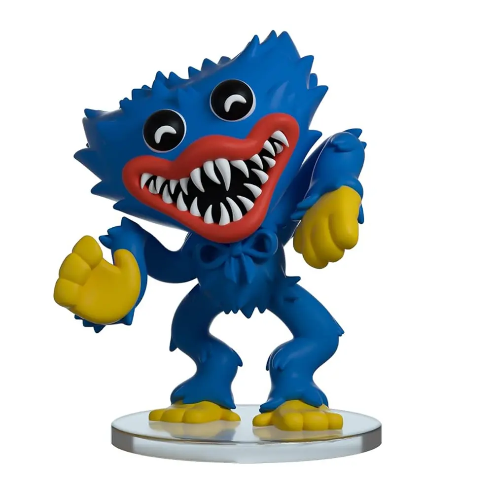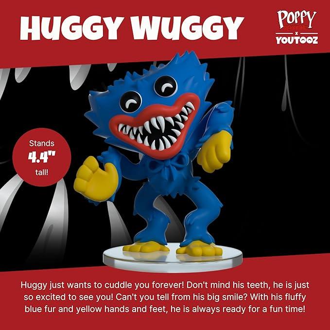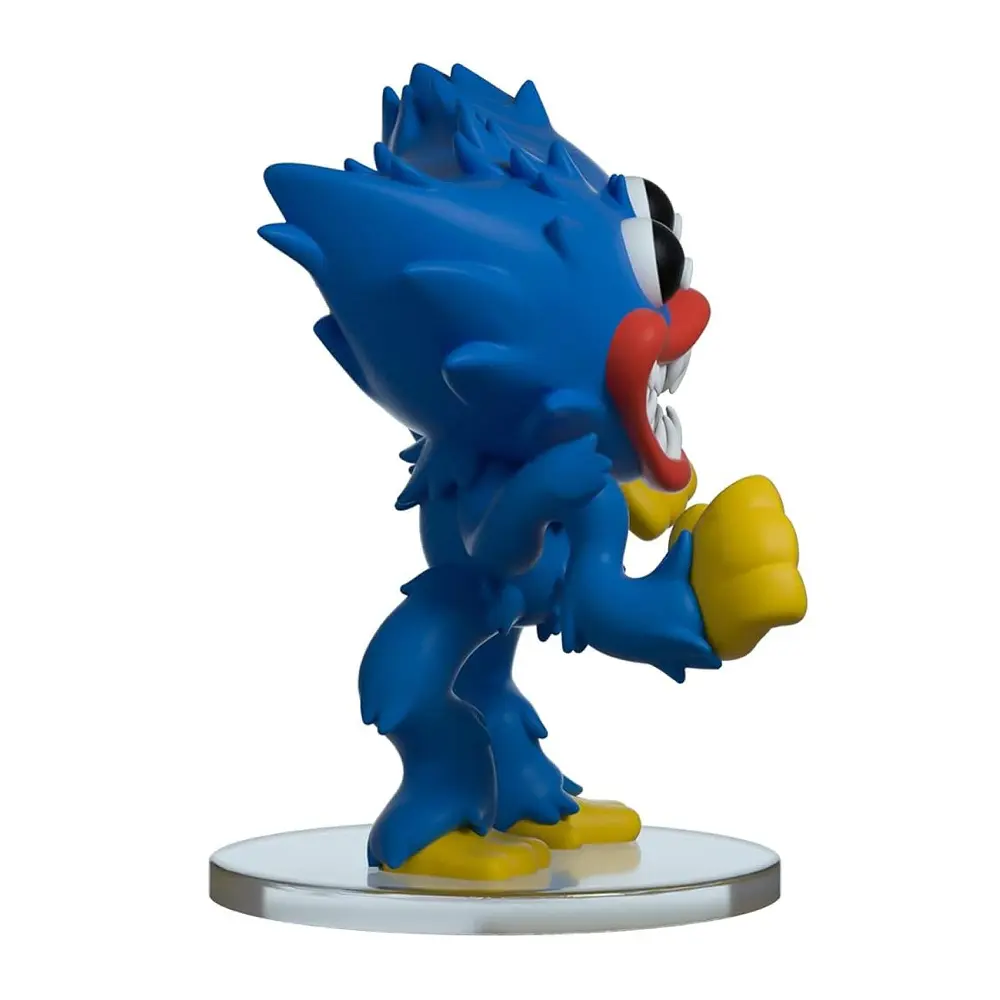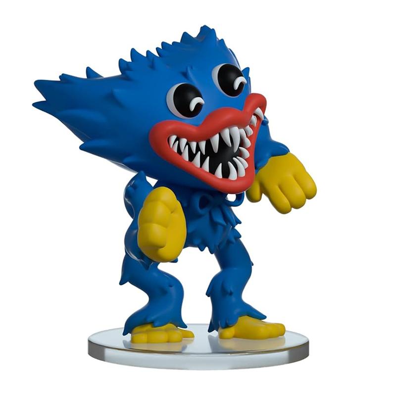 Huggy Wuggy, when he hugs you he'll never stop! Your friend Huggy! Huggy Wuggy, he'll squeeze you until you pop! You are now able to have your own Huggy Wuggy! Sculpted at 4.4 inches tall, Huggy just wants to cuddle you forever! Don't mind his teeth, he is just so excited to see you! Can't you tell from his big smile? With his fluffy blue fur and yellow hands and feet, he is always ready for a fun time! The exterior of his double-walled packaging shows the inside of the toy factory with its red, green, and yellow walls. The interior shows a black background with incredibly sharp teeth, saliva dripping down from them. The protective sleeve shows the outside of the toy factory in an all red colorway. This collectible ships in a matte, embossed, protective outer sleeve and a custom sized plastic protector for maximum protection during shipping.
