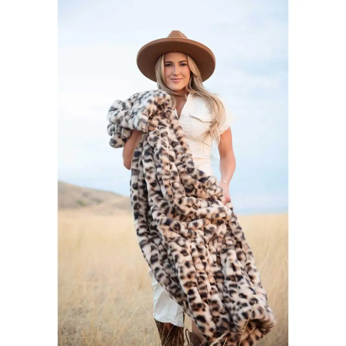 ·Details: Wrap yourself in the plush comfort of our Hugs Golden Leopard Blanket. This ultra soft, stretchy blanket features a soft golden tan background with subtle leopard-inspired spots for a touch of wild elegance. Cozy, stylish, and irresistibly soft, it's the perfect blend of warmth and luxury.