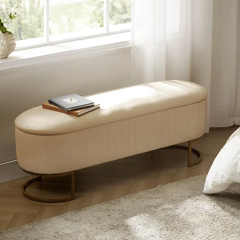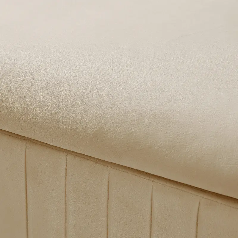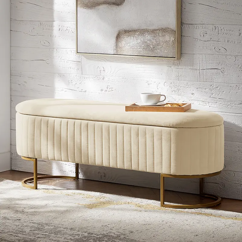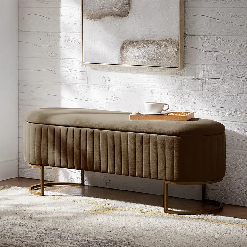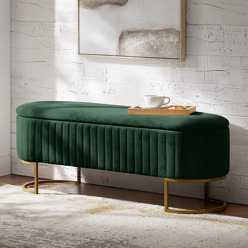 This ottoman bench is a versatile piece for any room. It combines storage with seating, making it a practical addition to your home. The combination of velvet and glossy metal ensures it complements various interior styles. Ideal for those looking for a functional and stylish storage solution.