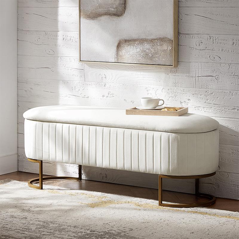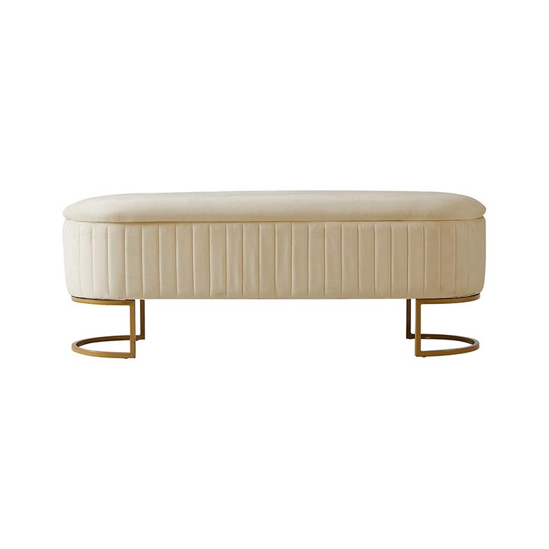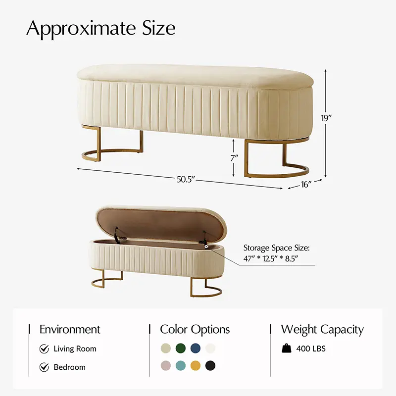 This 50.5" Storage Ottoman Bench features a velvet upholstery, offering a luxurious feel. The glossy metal base adds elegance. Perfect for bedrooms and entryways, it doubles as a storage solution. The flip-top lid ensures easy access to your belongings. Ideal for those seeking functionality and style.
