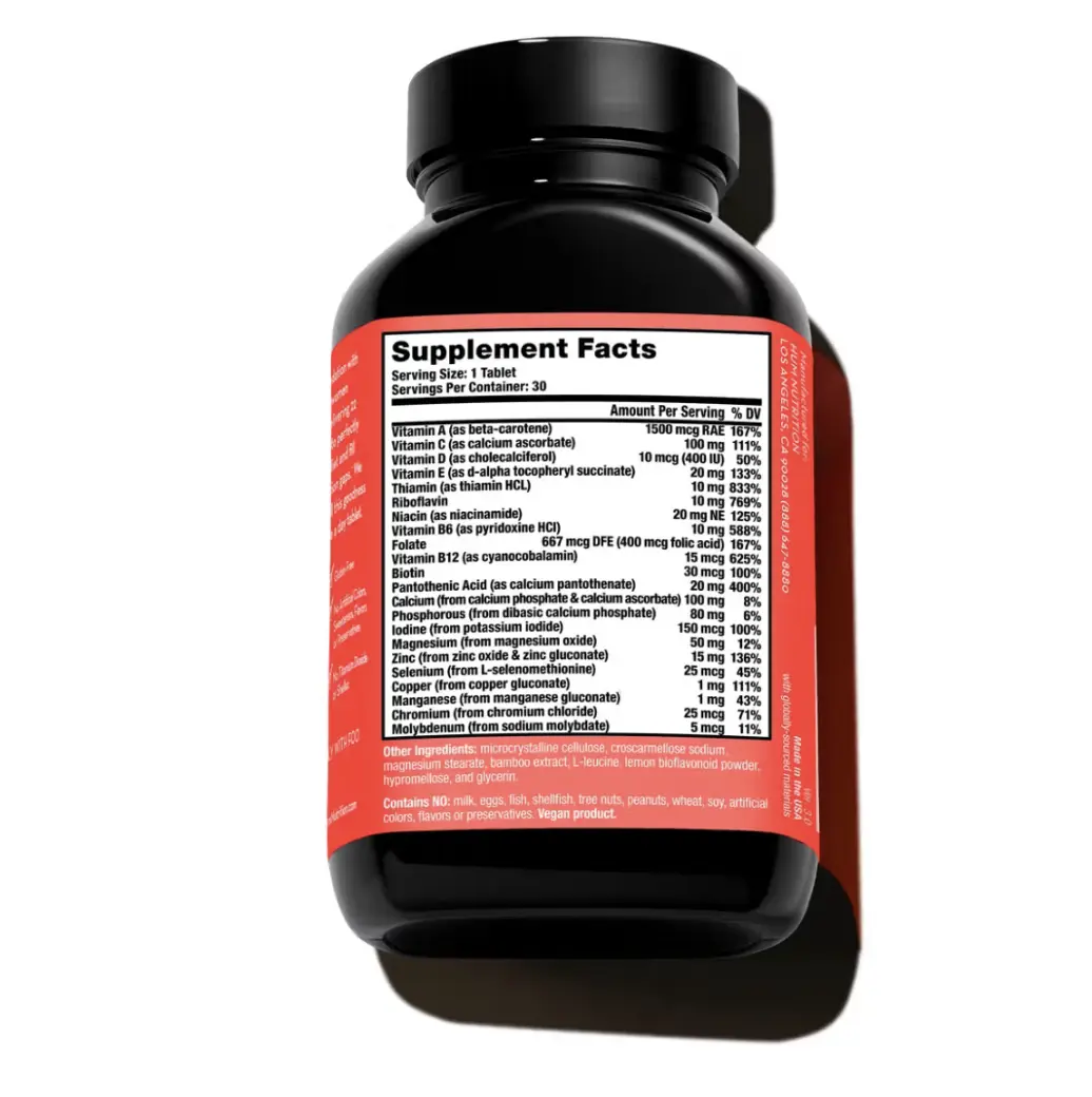 Ingredients1,500 mcg RAE Vitamin A (as beta-carotene) 100 mg Vitamin C (as calcium ascorbate) 10 mcg (400 IU) Vitamin D (as cholecalciferol) 20 mg Vitamin E (as d-alpha tocopheryl succinate) 10 mg Thiamin (as thiamin HCl) 10 mg Riboflavin 20 mg NE Niacin (as niacinamide) 10 mg Vitamin B6 (as pyridoxine HCl) 667 mcg DFE (400 mcg folic acid) Folate 15 mcg Vitamin B12 (as cyanocobalamin) 30 mcg Biotin 20 mg Pantothenic Acid (as calcium pantothenate) 100 mg Calcium (from calcium phosphate, ascorbate) 80 mg Phosphorus (from dibasic calcium phosphate) 150 mcg Iodine (from potassium iodide) 50 mg Magnesium (from magnesium oxide) 15 mg Zinc (from zinc oxide, gluconate) 25 mcg Selenium (from L-selenomethionine) 1 mg Copper (from copper gluconate) 1 mg Manganese (from manganese gluconate) 25 mcg Chromium (from chromium chloride) 5 mcg Molybdenum (from sodium molybdate)
