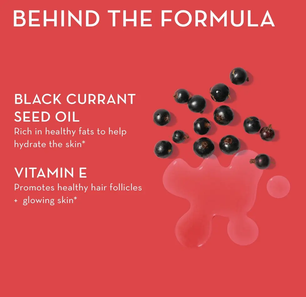Formula with black currant seed oil and Vitamin E for hydrated skin and hair health.