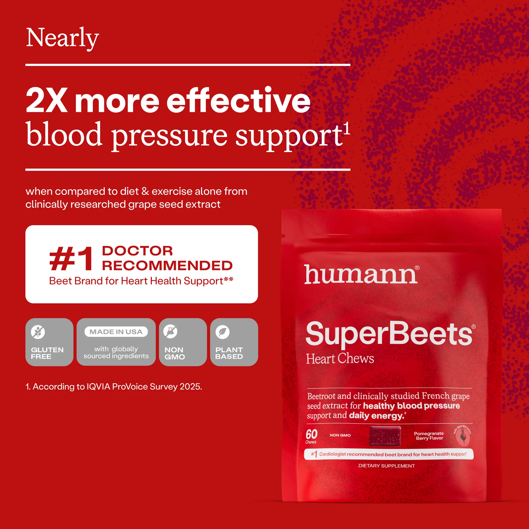 Humann SuperBeets Heart Chews support healthy blood pressure, circulation and blood flow with powerful, plant-based ingredients, including clinically researched grape seed extract from Southern France.