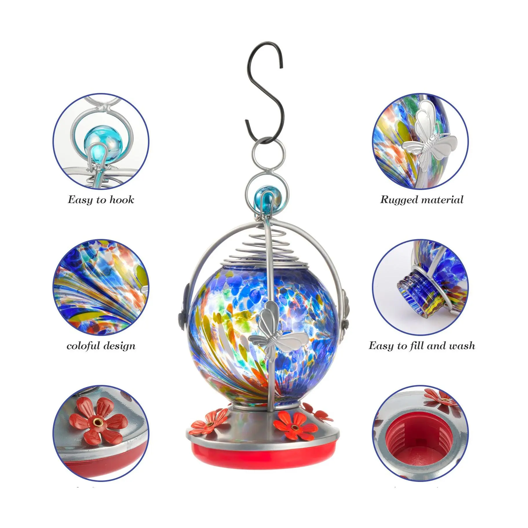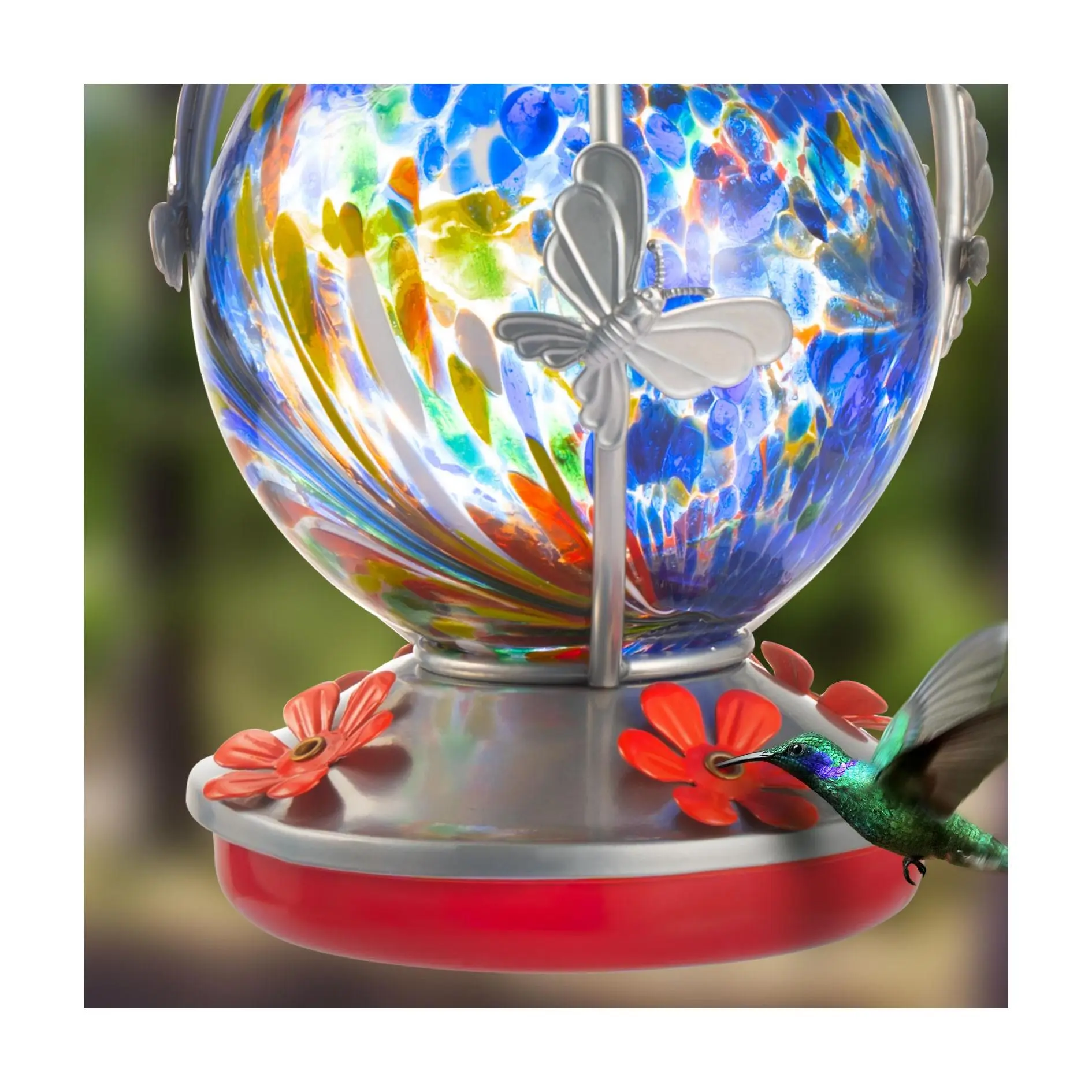 Bring the beauty and charm of hummingbirds right into your backyard with this delightful feeder. Its robust glass construction and gorgeous design with decorative flower detailing adds a touch of elegance to any outdoor space. Each piece offers a unique and beautiful look, complete with a metal hanger for easy installation and four feeding ports to welcome multiple birds. From Backyard Expressions.