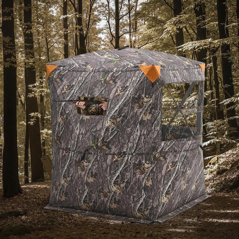 This hunting blind is built for durability. The design includes a carrying bag for easy transport. The blind's structure allows for a quiet hunting experience, thanks to its silent zipper door and window. It's a reliable choice for turkey and deer hunting, ensuring a comfortable and secure environment.
