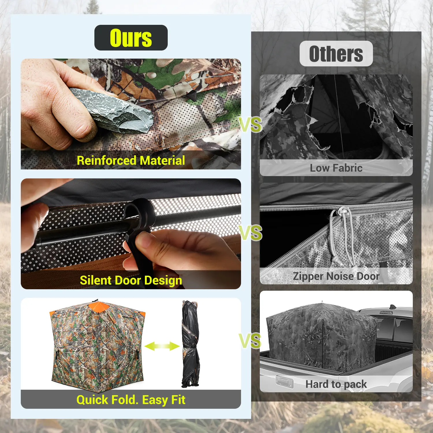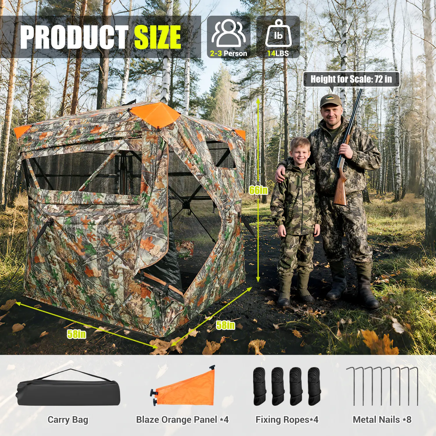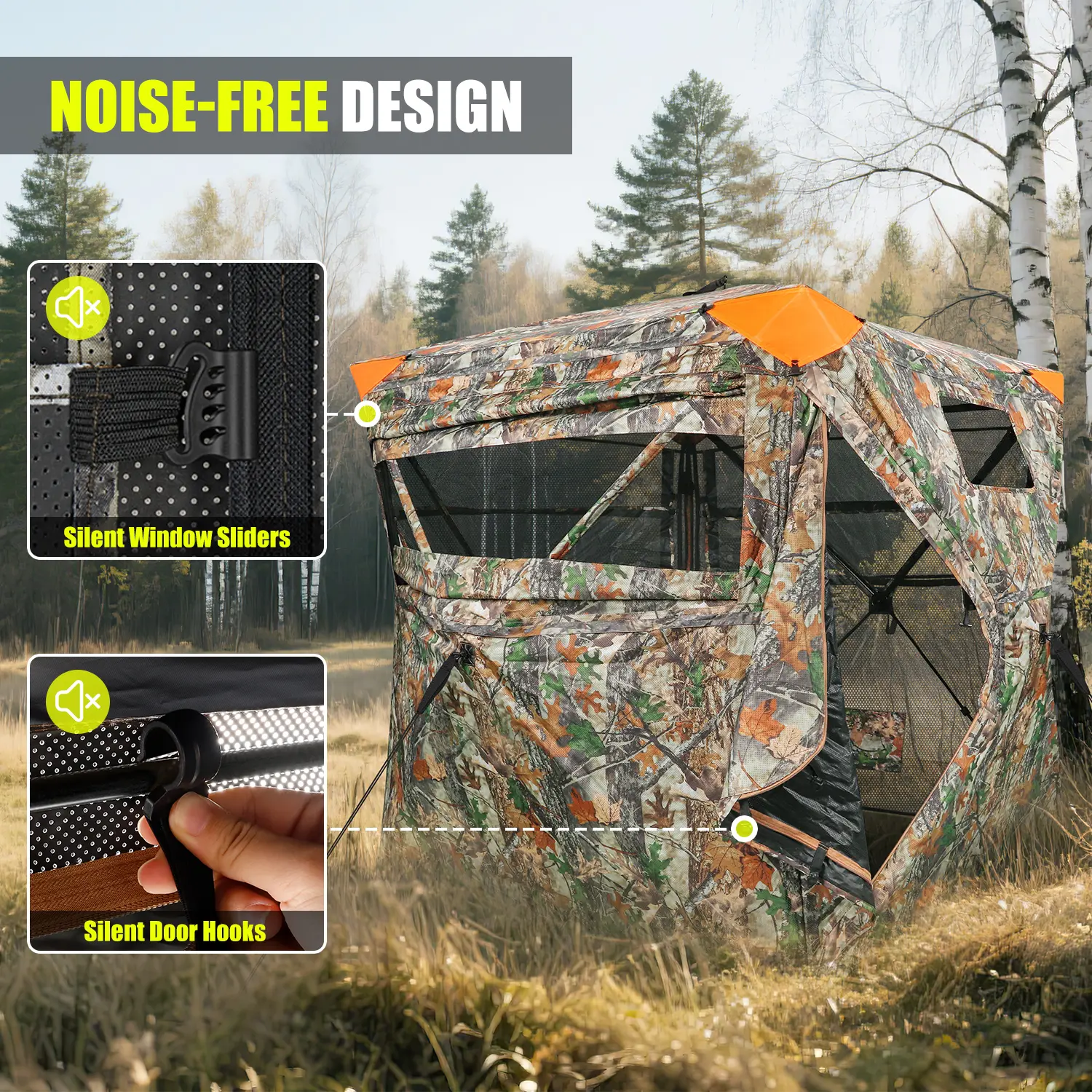 Silent Entry & Windows:Our hunting blind is equipped with silent-slide window tracks and hook-quiet doors, allowing you to make adjustments without spooking nearby game.