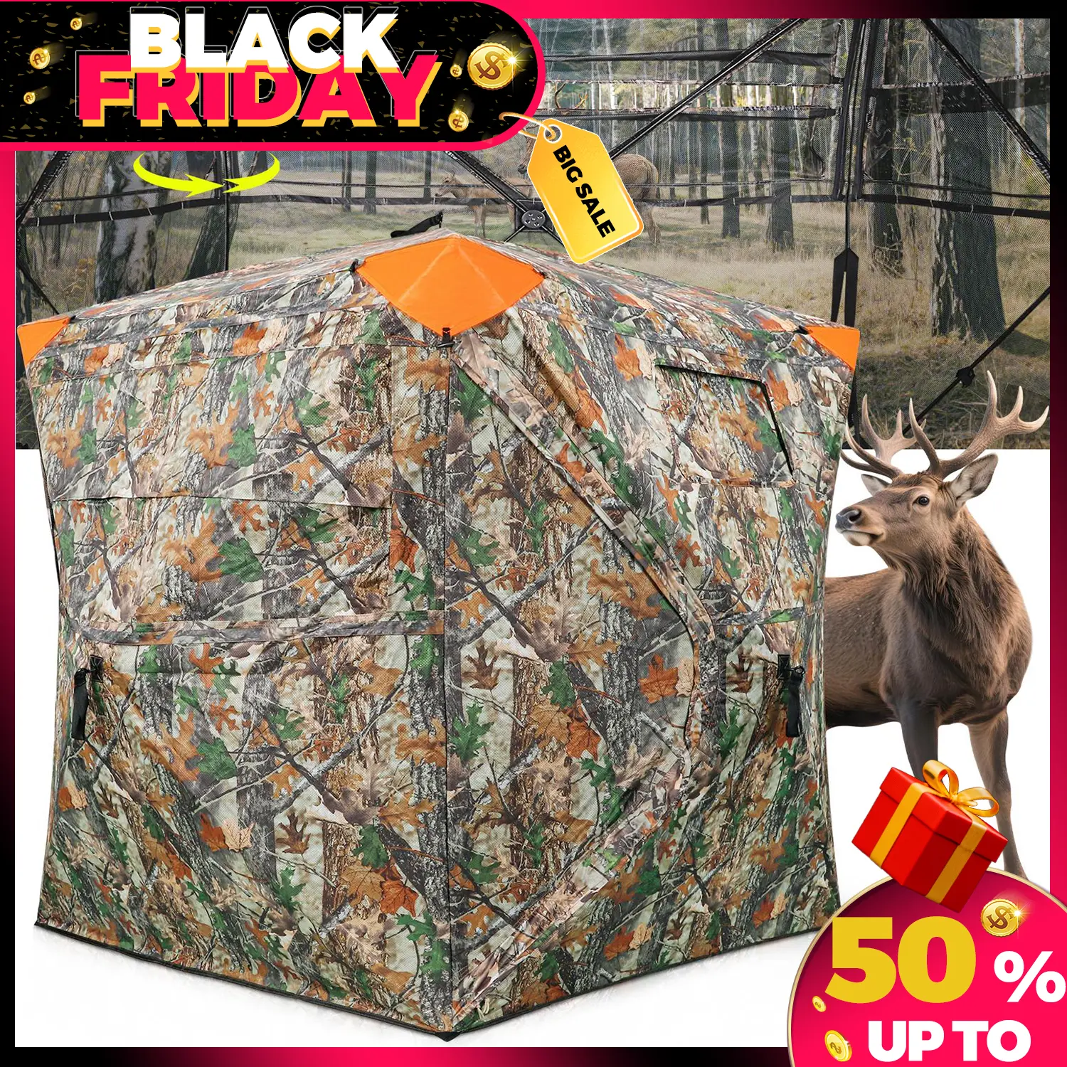 270°/360° One-Way See-Through:See everything around you without being seen. Crystal-clear visibility and camouflage pattern ground blind let you track deer, turkey, and other game while staying completely hidden.