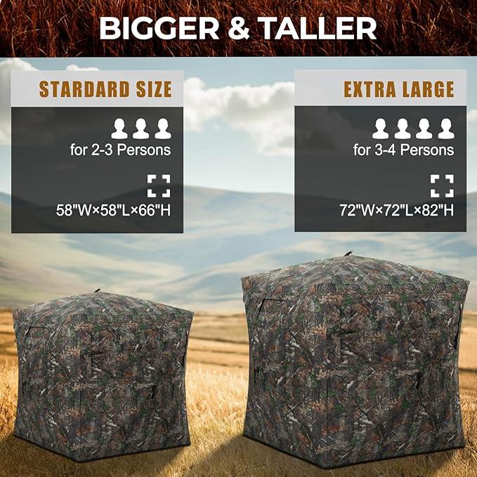 ·【LARGER SPACE FOR 3-4 PERSONS】With the dimensions of 82”height, and a floor space of 72" x 72",HUNTSEN hunting blind provides plenty of room for 3-4 persons and allows most people to stand in it, ideal for deer hunting, giving you more leg room and floor space for your hunting gear like hunting chairs.