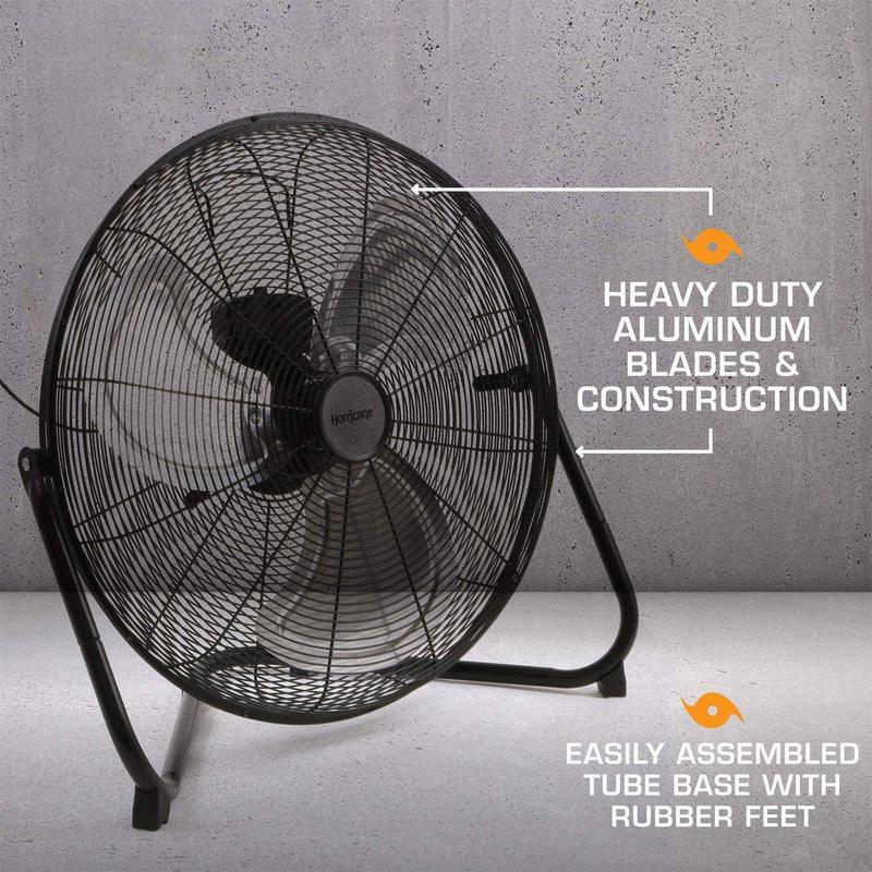Step into the realm of breezy sophistication with the Hurricane Pro 20-inch High-Velocity Metal Floor Fan, a symphony of controlled airflow encased in a sleek and space-conscious design. Crafted by industry leaders, this fan features a sturdy all-metal build, striking black powder-coated finish, and efficient aluminum blades for durability.Despite its small size, this portable fan is powerful, circulating air in various spaces. Use in your home garage, in your workshop, or as a gym fan or workout fan.Hurricane gives you control with 3 speeds, letting you adjust the fan to suit your space without losing its high-velocity power. Additionally, the adjustable tilt feature provides further flexibility, enabling you to direct the airflow precisely where it's needed. Running at 5,300 CFM and 1,450 RPM, it's serious about delivering a refreshing atmosphere.Its adjustable tilt feature makes directing air easy, reaching every corner with Hurricane's cooling expertise. Whether on the wall or floor, it effortlessly fits into any space, always ready to provide a breath of fresh air. This versatile wonder comes complete with a wall mount bracket and a generous 6-foot 120-volt power cord for hassle-free installation.Embrace the cooling embrace of innovation, your sanctuary awaits in the gentle hum of Hurricane Pro 20-inch High-Velocity Metal Floor Fan controlled airflow.