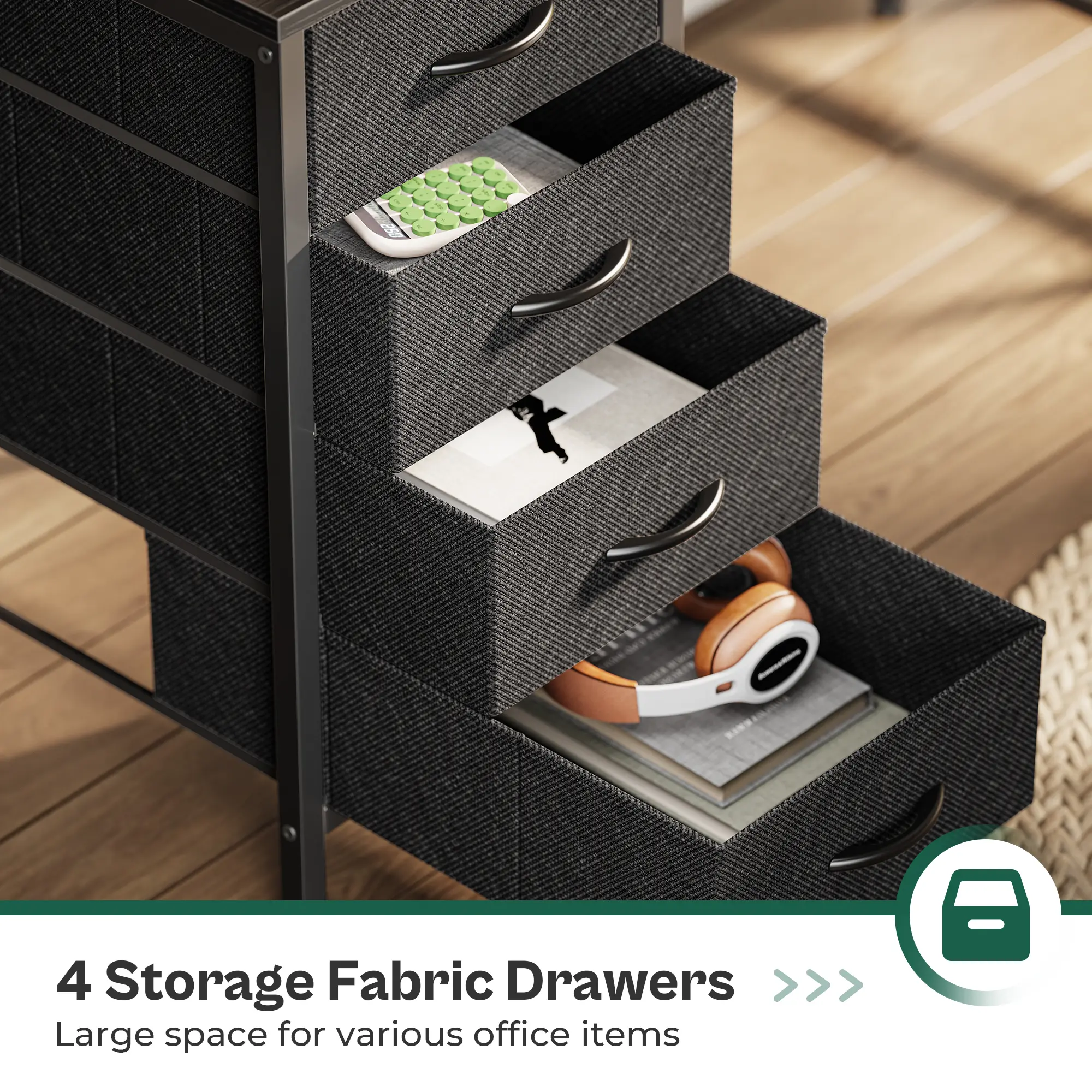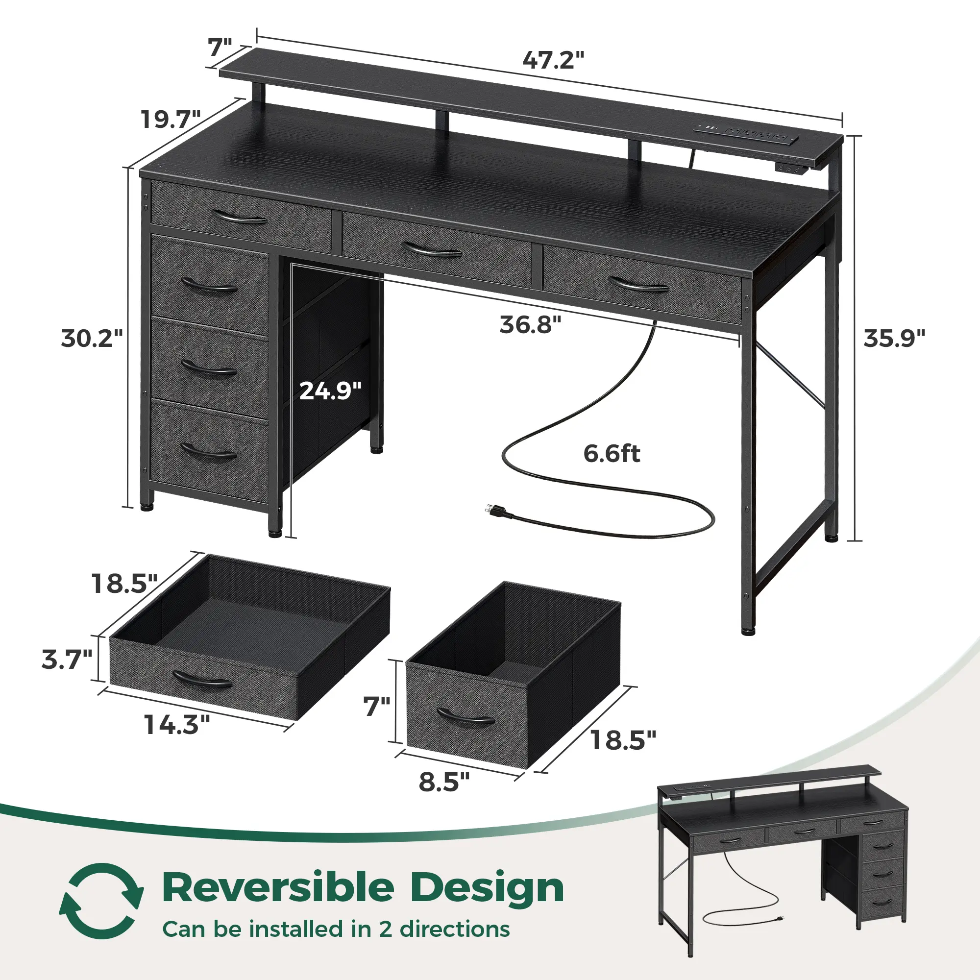 ·【DESK WITH DRAWERS】Reversible design, install 4 fabric drawers on either the left or right side to adapt to your needs. The 4 spacious drawers organize your books, office essentials, or gaming devices in a breeze. Ample storage office desk with drawers ensure your space stays tidy and organized