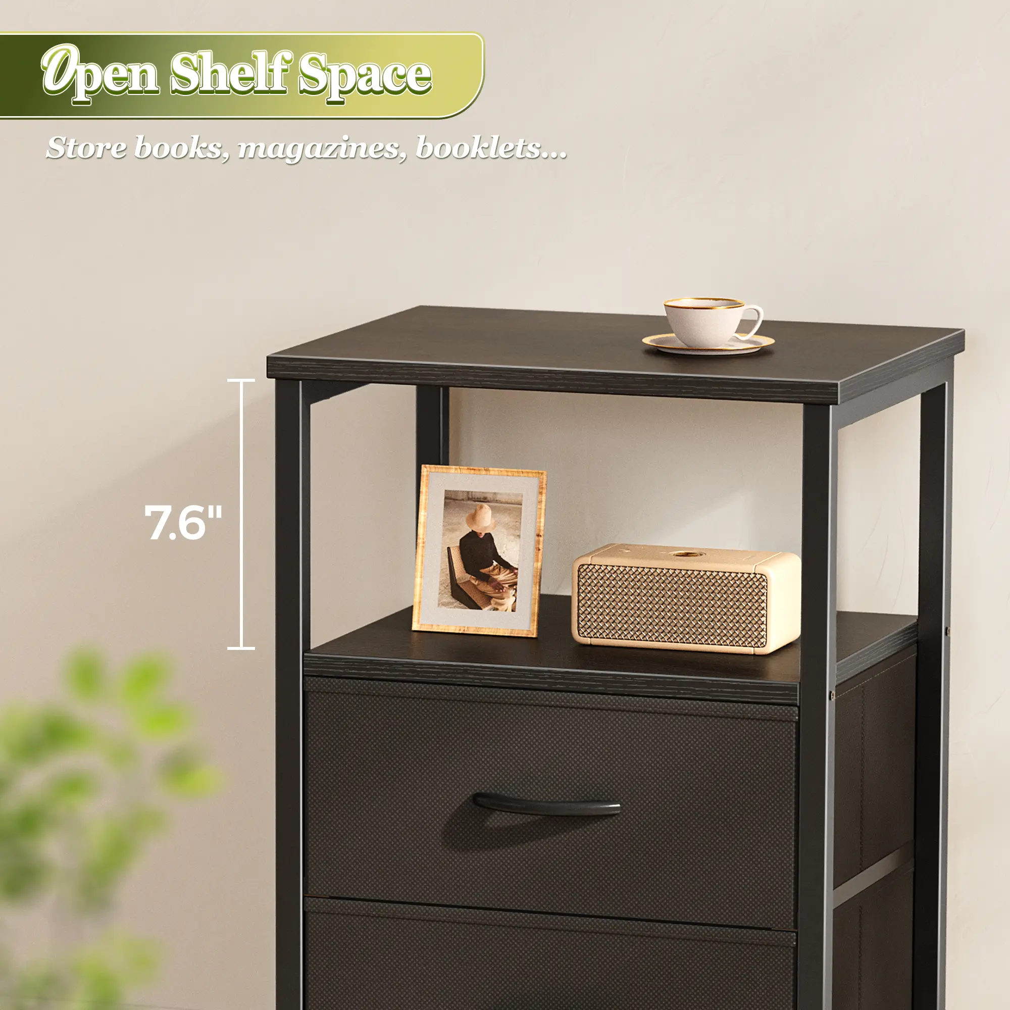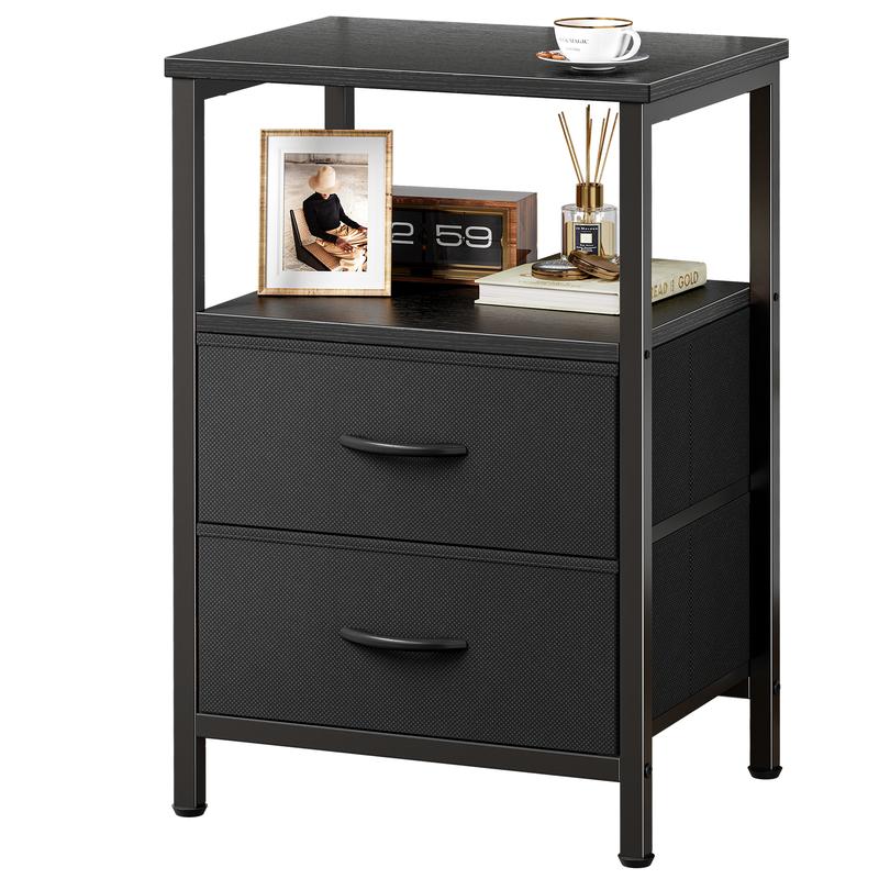 ·【Nightstand with 2 Drawers】2 spacious fabric drawers and an open shelf help you organize nighttime essentials, books, glasses, remotes, and more, all within easy reach. Enjoy a cleaner, calmer space with this bedside table