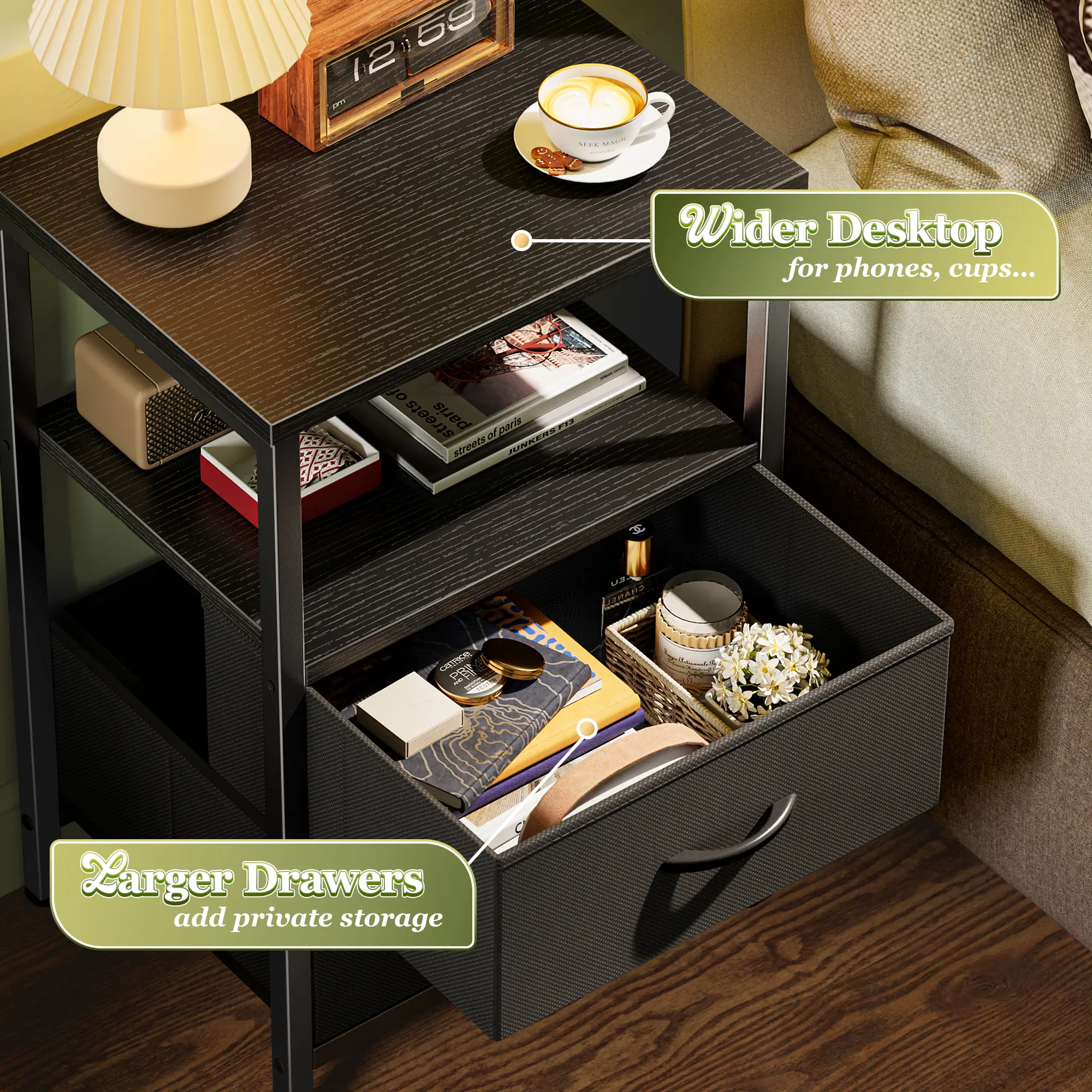·【Perfect for Small Spaces】With its compact design and modern silhouette, this night stand with drawers fits effortlessly in bedrooms, living rooms, dorms, or apartments. Use it as a bedside table, couch side table, or extra storage end table anywhere you need it