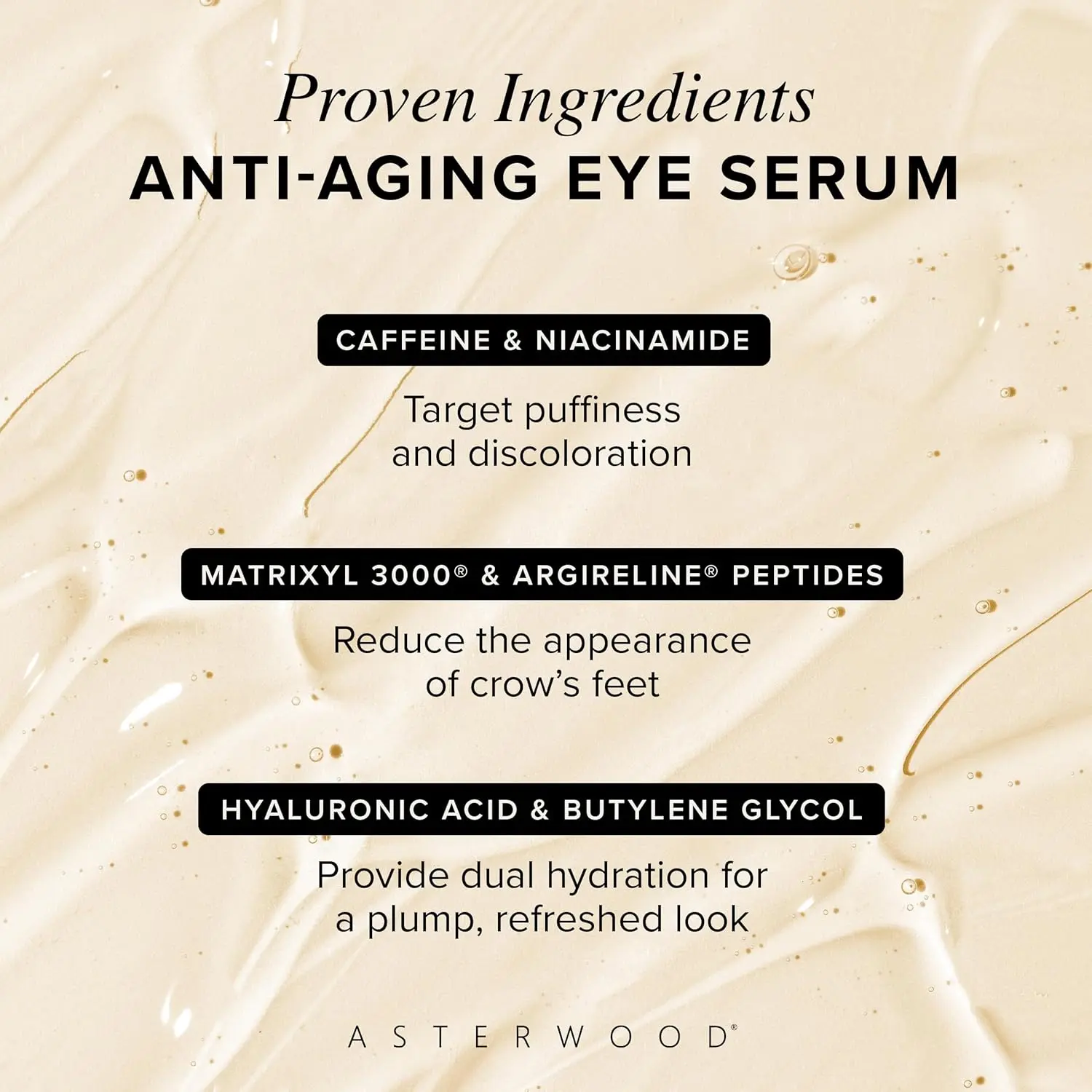 Revive tired eyes with Asterwood Hyaluronic Acid Eye Serum, a powerful anti-aging under-eye treatment designed to target dark circles, puffiness, fine lines, wrinkles, and crow’s feet. Infused with Hyaluronic Acid, Matrixyl 3000 peptides, Niacinamide, and Caffeine, this lightweight eye serum delivers hydration, firmness, and radiance for a refreshed look.