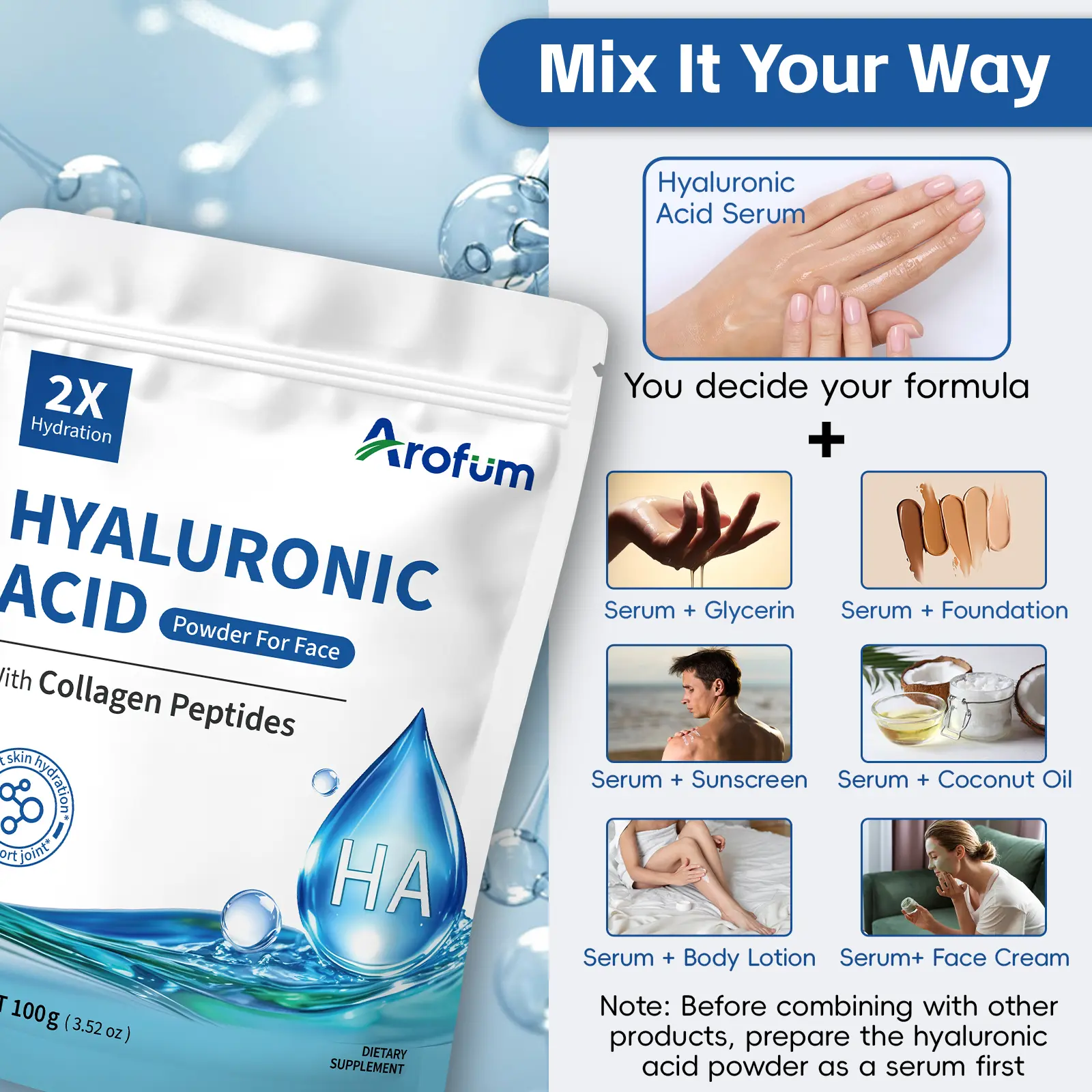 Really good quality powder! It mixes easily and works great for making my own hydrating serum. My skin feels softer and more plump after using it. No weird smell or additives, just clean ingredients. Great value and fast shipping too!