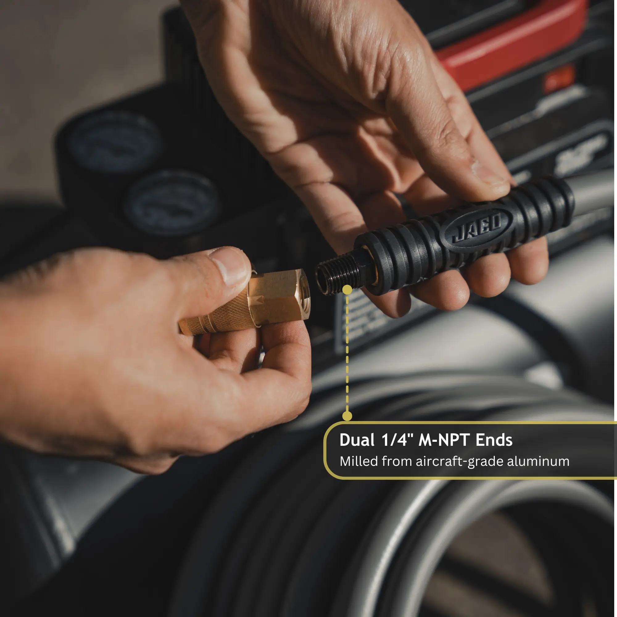 ·1/4" M-NPT FITTINGS - equipped with dual 1/4" M-NPT end fittings built from military-grade, aircraft-quality billet aluminum for airtight compatibility with your air compressor tools & accessories - including tire inflators, gauges, chucks, staple guns, trim & brad nailers, air blowers, ratchet wrenches, sanders, saws, & much more.