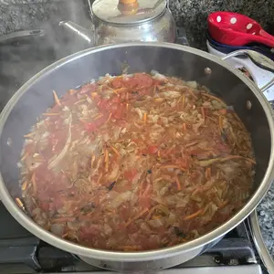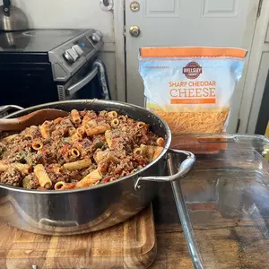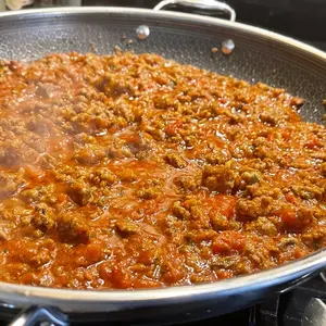 I like that I can really spread the meat out and cook it quickly and evenly; and then add my sauce and pasta to only dirty one pan.