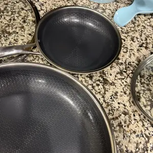 Frustrating spent weeks getting a replacement set of pans as I was sent a returned item that was neither reconditioned or repackaged. If you received pans already in the grey bags, return them as that is an obvious sign they are not from the factory. The pans I initially received had issues in the center with scratched up interior surface. Everything was fine when I got the new pans after researching seasoning and cleaning tips that are not great from the videos the instructions point you to. Simple things like how often to season, to use soap or not, bar keepers friend for exterior surfaces, etc just are not part of the manufacturer instructions, if you have issues with warranty typically it's due to misuse, seems they would be better at how to care for you products up front. Again frustrating, but overall good product at the end so will just be happy that eventually they got the order right and can enjoy cooking again. It was mother's day, so the delay was just that much more painful. Got a note from Hexclad they read these reviews and will act on them, glad they are paying attention and hope others can avoid the delays and effort that I had to go through in the future.