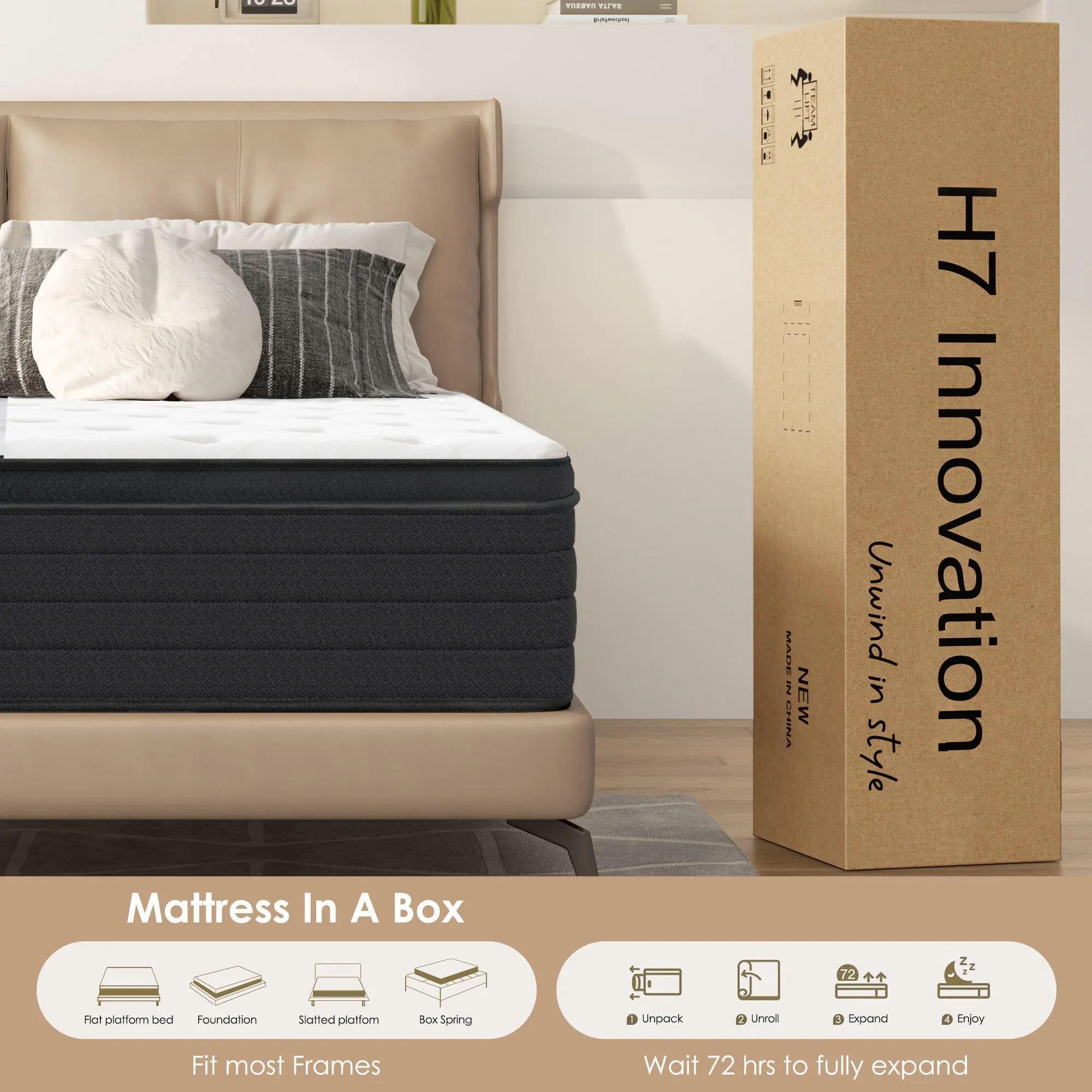 Conveniently compressed into a single box, this mattress expands within 24-72 hours. We offer a 100-night trial and a 10-year warranty. Contact us anytime for support. Get ready for a hassle-free, comfortable night's sleep today!