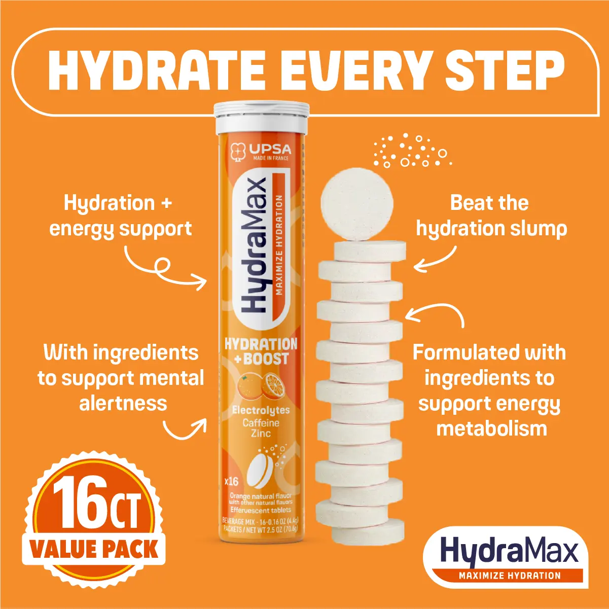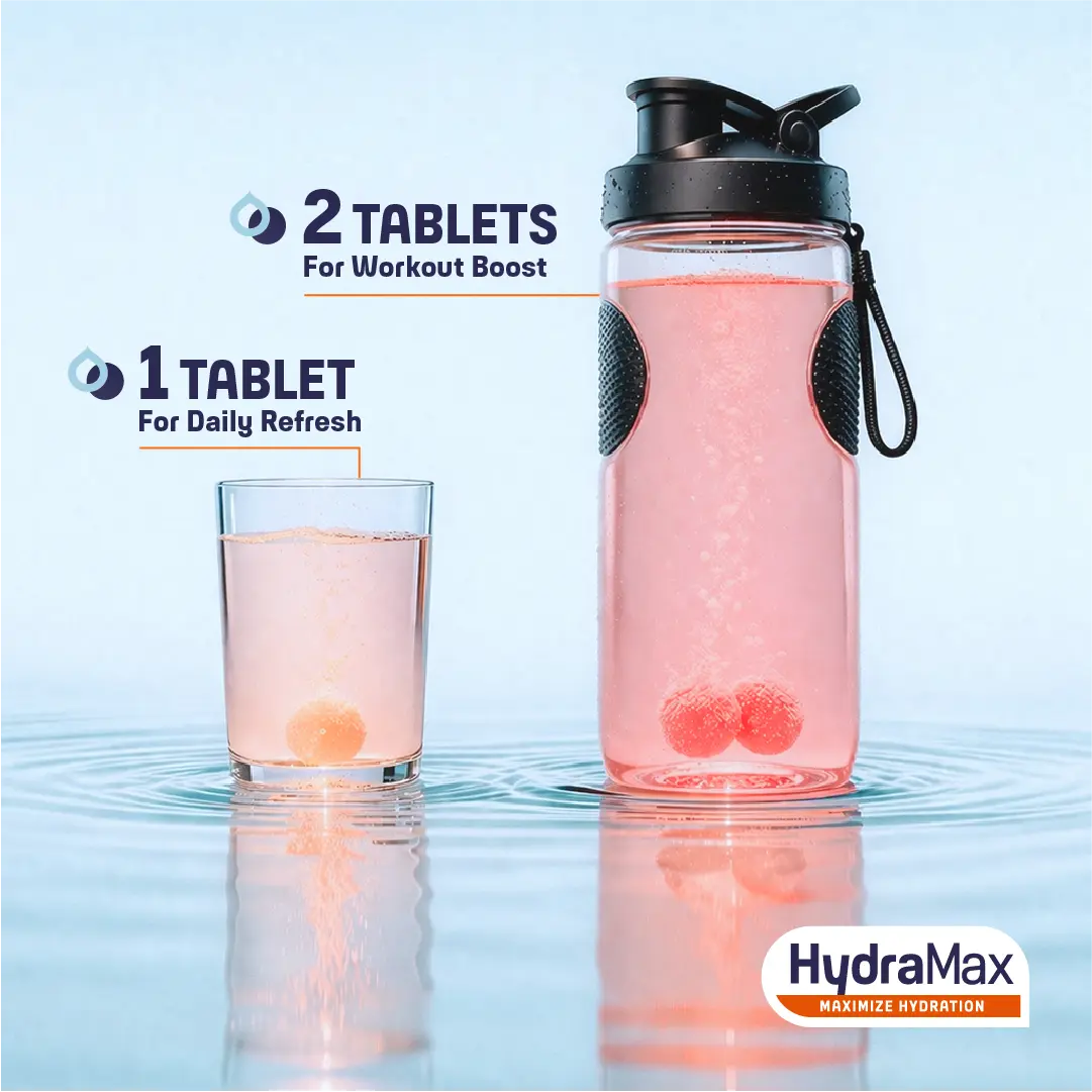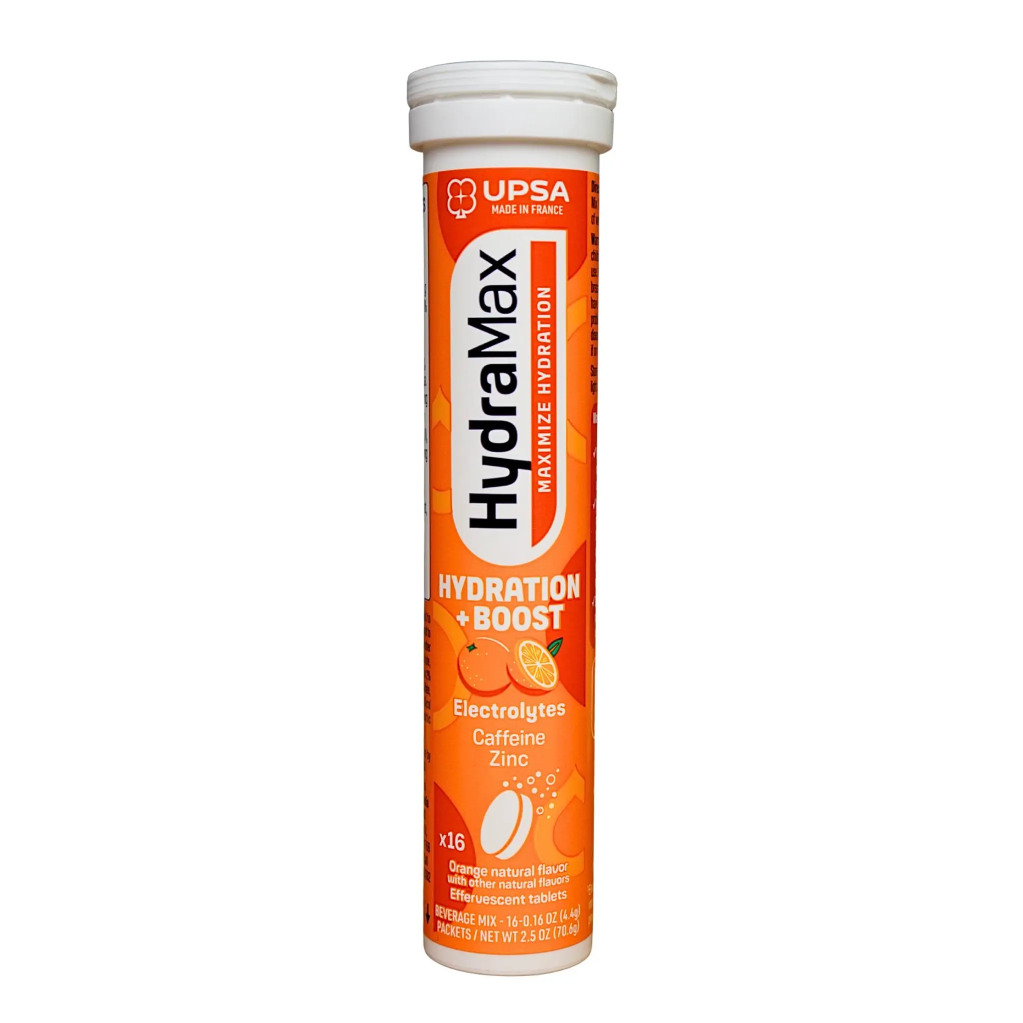 HydraMax Hydration + Boost is ideal for moments requiring hydration with an extra boost. This effervescent formula combines essential electrolytes, caffeine, and zinc to support hydration during busy days, travel, or long work hours. Each tablet dissolves easily in water, creating a refreshing orange-flavored drink. It provides a gentle boost without the heaviness of traditional energy drinks.
