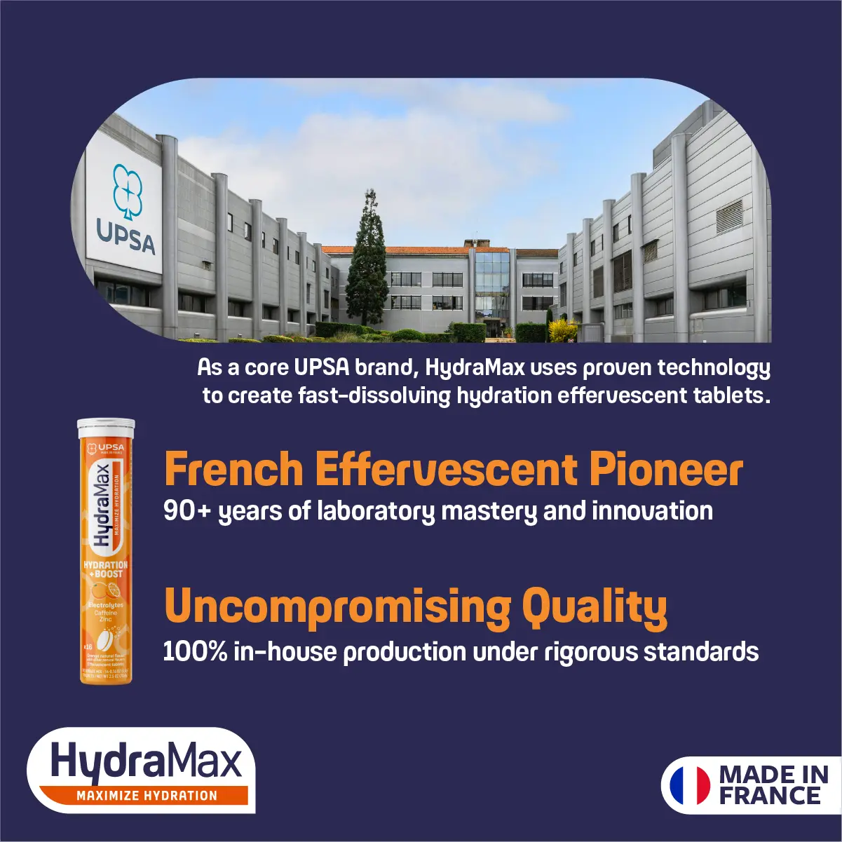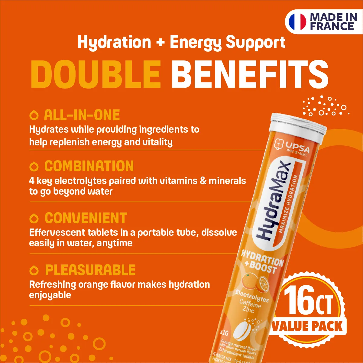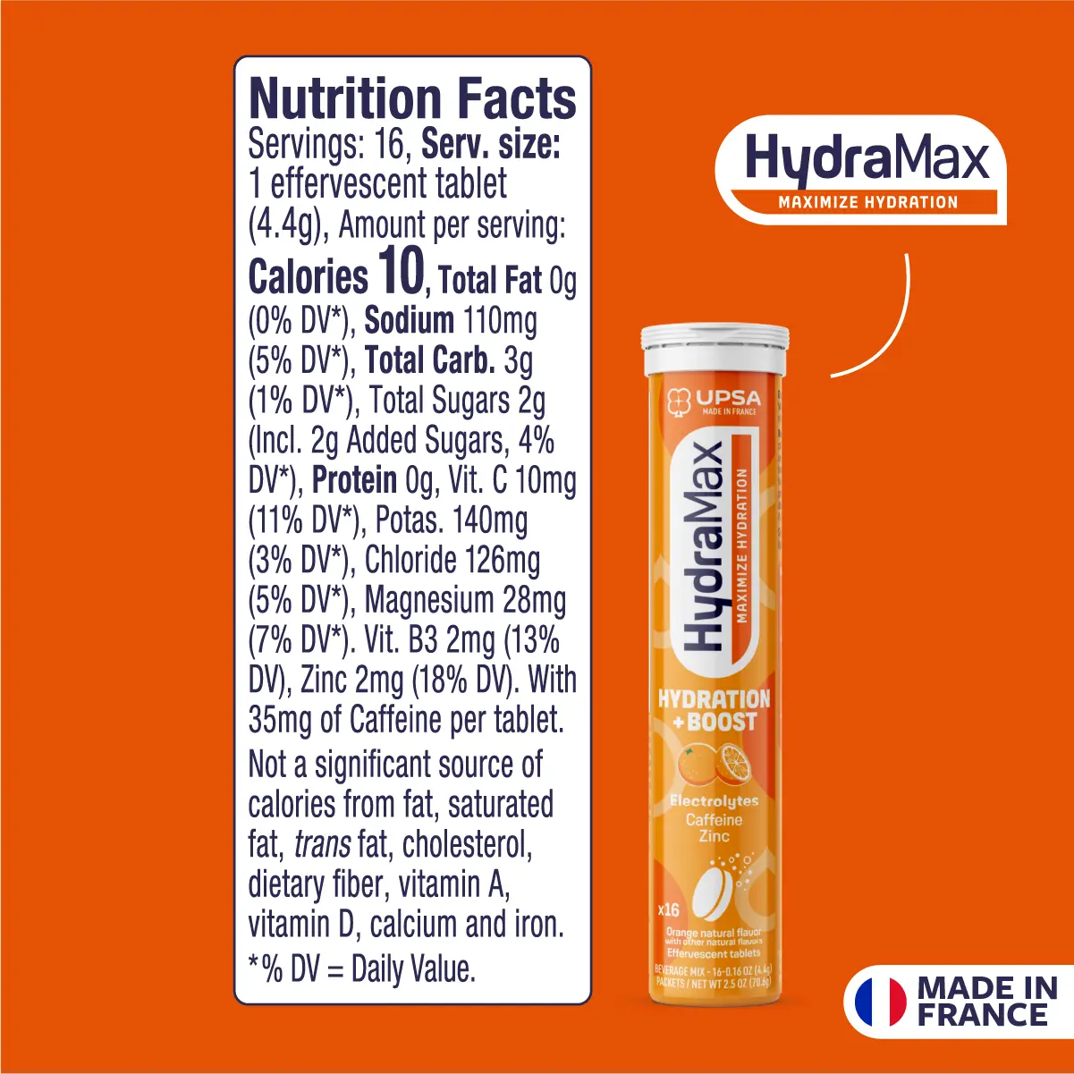 HydraMax Hydration + Boost is ideal for moments requiring hydration with an extra boost. This effervescent formula combines essential electrolytes, caffeine, and zinc to support hydration during busy days, travel, or long work hours. Each tablet dissolves easily in water, creating a refreshing orange-flavored drink. It provides a gentle boost without the heaviness of traditional energy drinks.