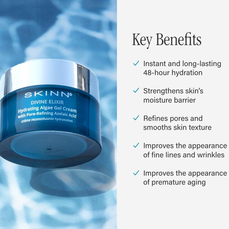 Experience the ultimate in skin care with Skinn Cosmetics Hydrating Algae Gel Cream. This light and airy moisturizer harnesses the benefits of thalassotherapy by utilizing seawater ingredients to provide instant and lasting hydration to your skin.