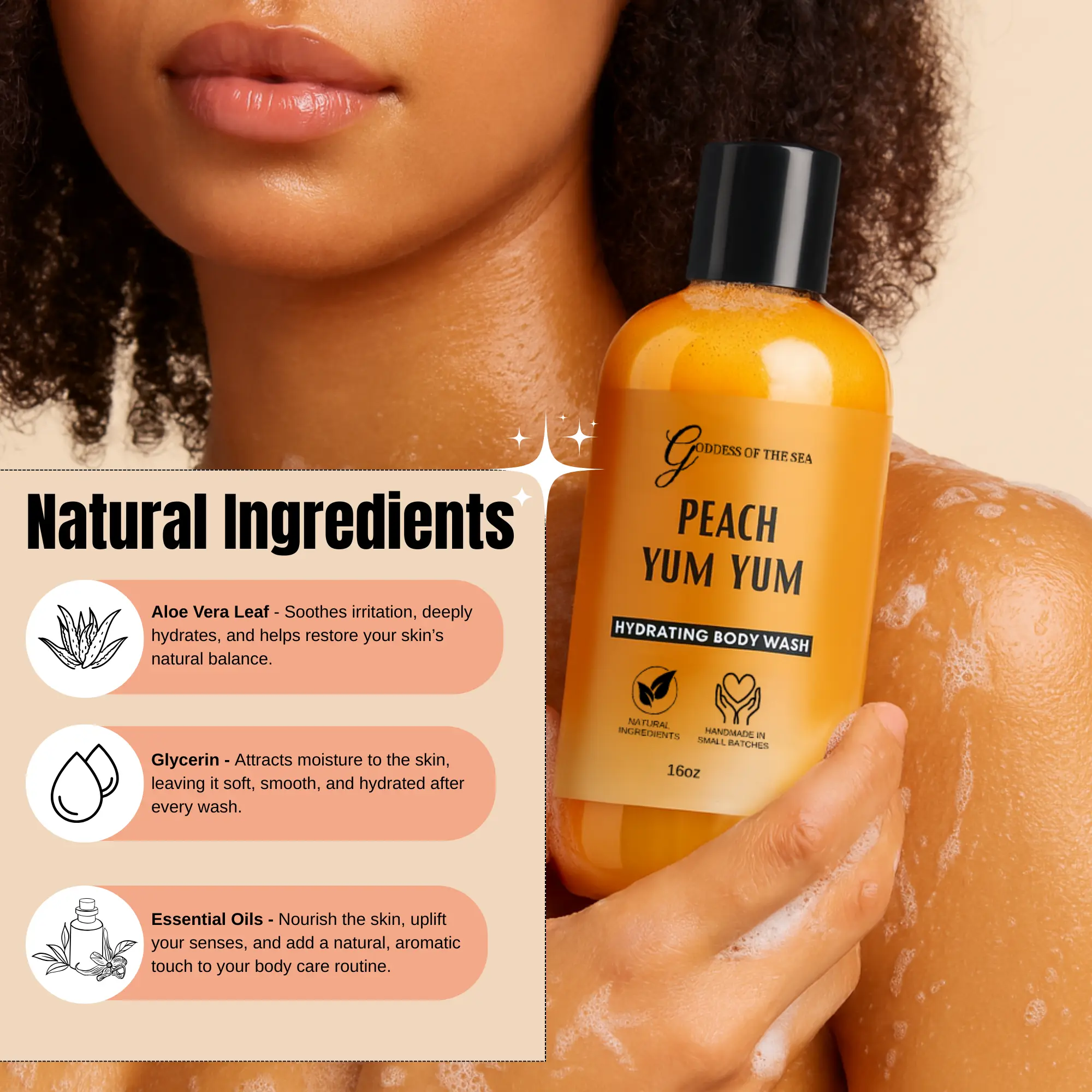 Your shower just became self-care, Goddess . Our creamy body wash blends aloe vera extract, glycerin, argan oil, avocado oil, and coconut oil to give your skin the love it deserves.