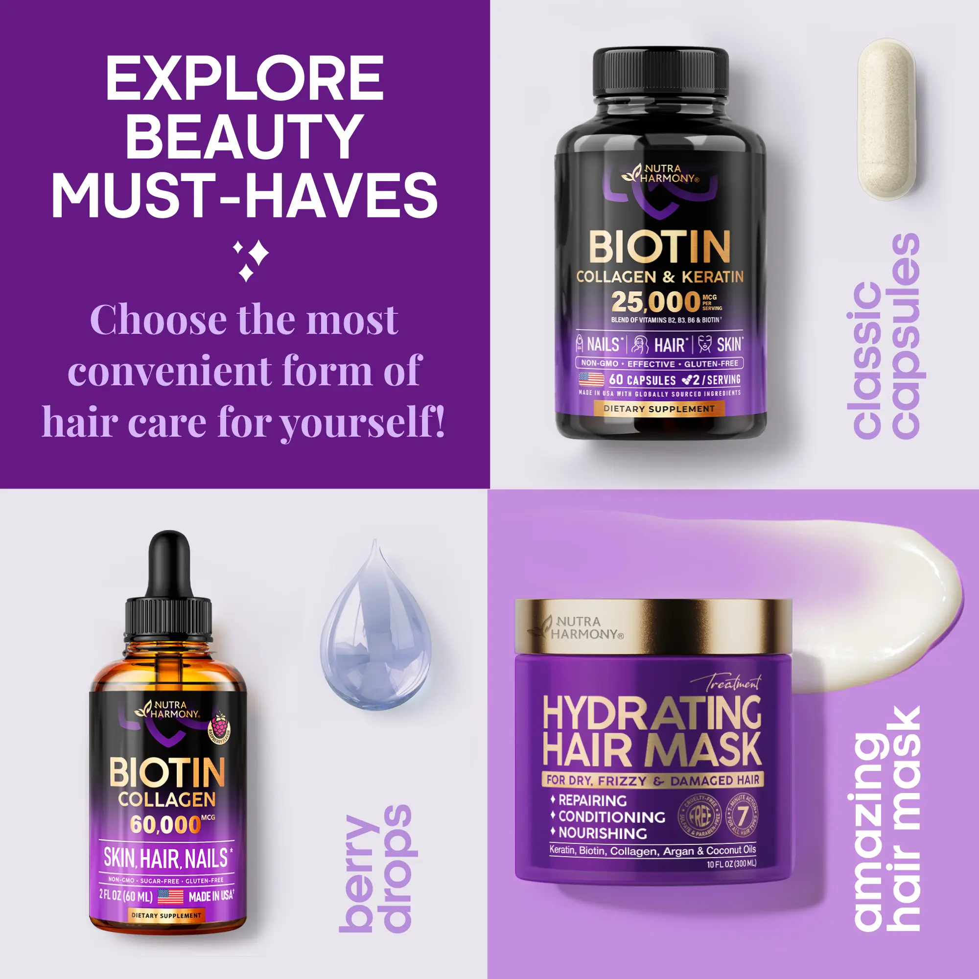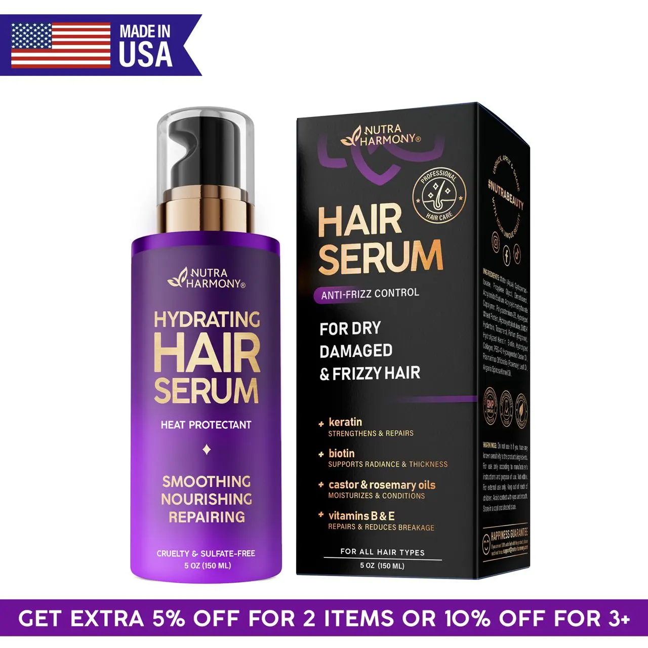 ·Hydrating Hair Serum — Transform your hair with NUTRAHARMONY's Hydrating Hair Serum! This lightweight elixir hydrates, nourishes, and repairs, adding softness and shine. Infused with Keratin, Biotin, Castor Oil, and Rosemary oil, powered with Vitamins B and E, it delivers deep moisture for smooth & silky-vibrant locks.