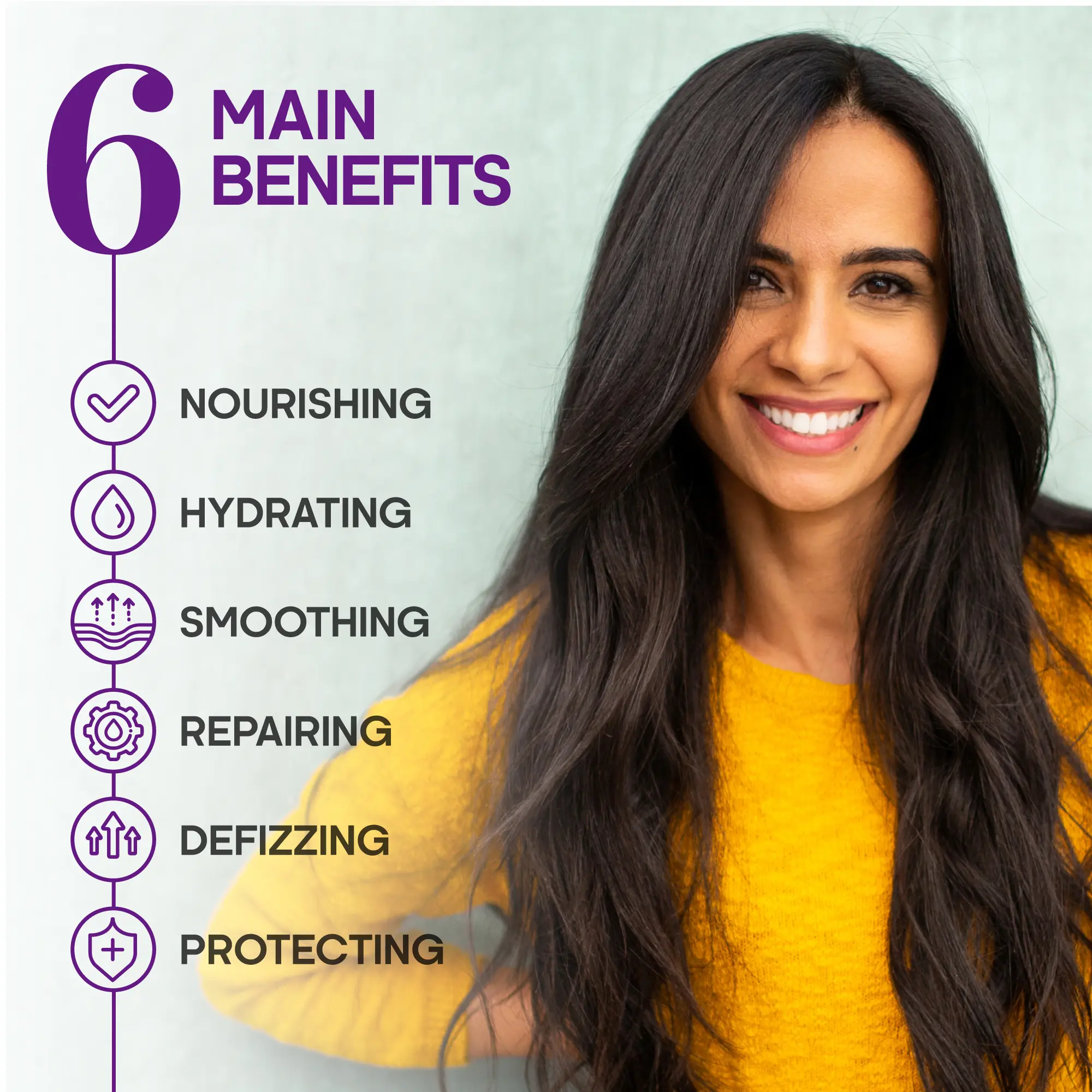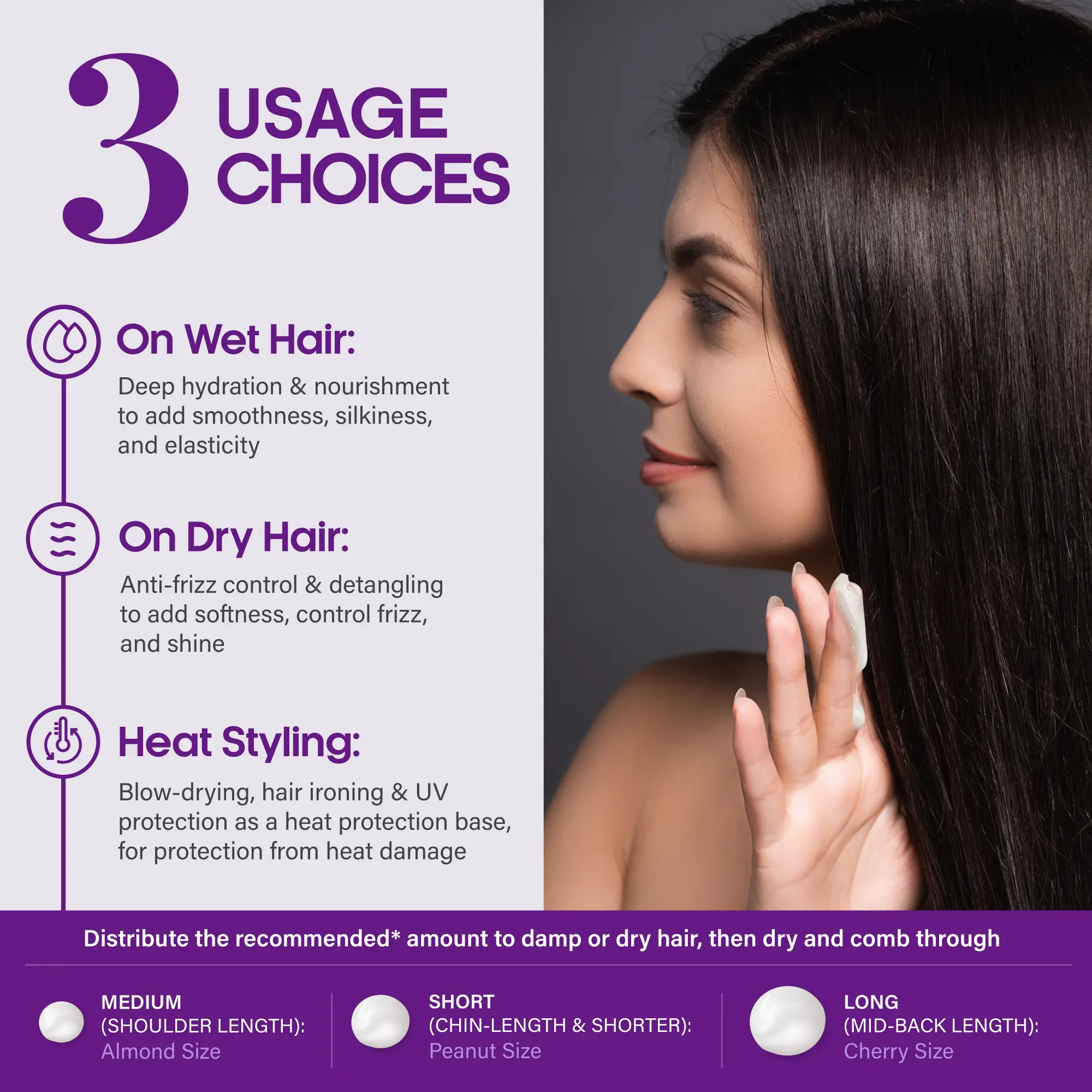 On Wet Hair for Hydration, Nourishment, and Smoothness: Distribute through clean, towel-dried hair, focusing on the lengths. Dry and comb through. On Dry Hair for Softness, Frizz Control, and Heat Protection: Apply to the lengths of dry hair, distributing the recommended amount thoroughly. Comb through. Recommended Amount: Short Hair (Chin-length & shorter): Peanut size. Medium Hair (Shoulder length): Almond size