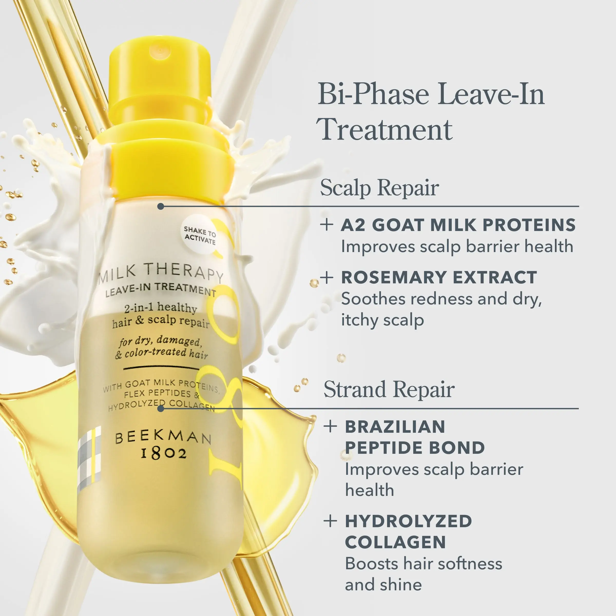 Milk Therapy Peptide Leave-In Treatment: Shake the bottle generously before applying. Spray onto damp, towel-dried hair from scalp to ends. Comb through for even distribution and style as usual.